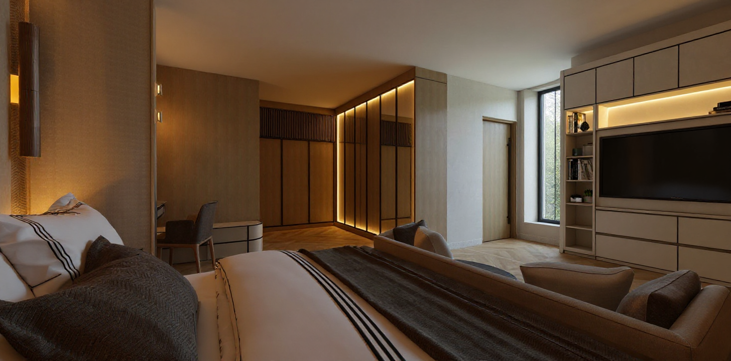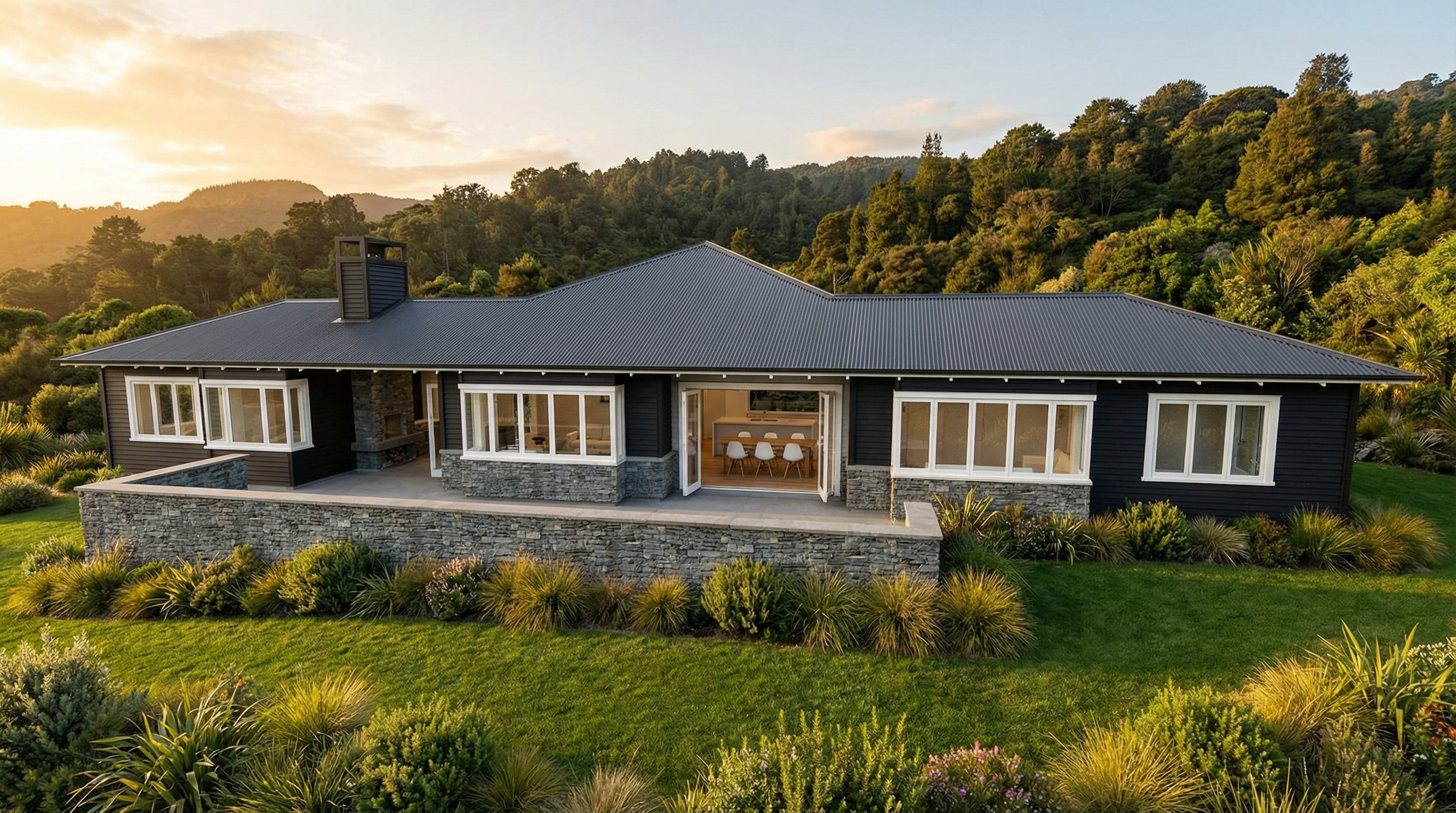 keep existing image perspective black cladding to house with cedar features black window joinery lawns timber deck extensive native planting background trees sunset