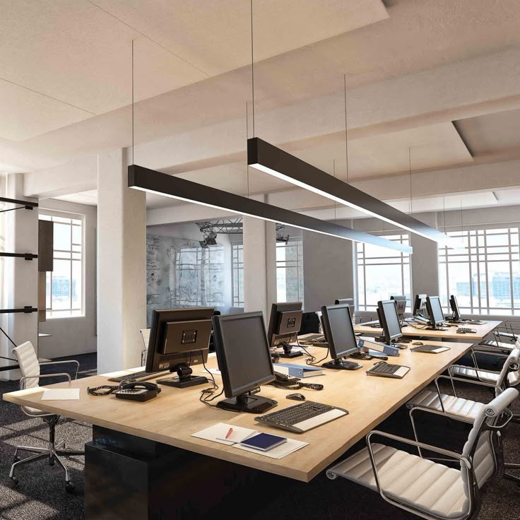 modern interior shot interior render of a modern corner office 11m x 8m 2 70m height with gray 60x60 cm floor tiles smooth white ceiling recessed double spotlights glass partitions with 1 00m high white drywall base oak wood cabinet near entrance windows on both exterior sides starting at 1 00m from floor linear pendant lights in central rooms elegant and minimalist style architecture
