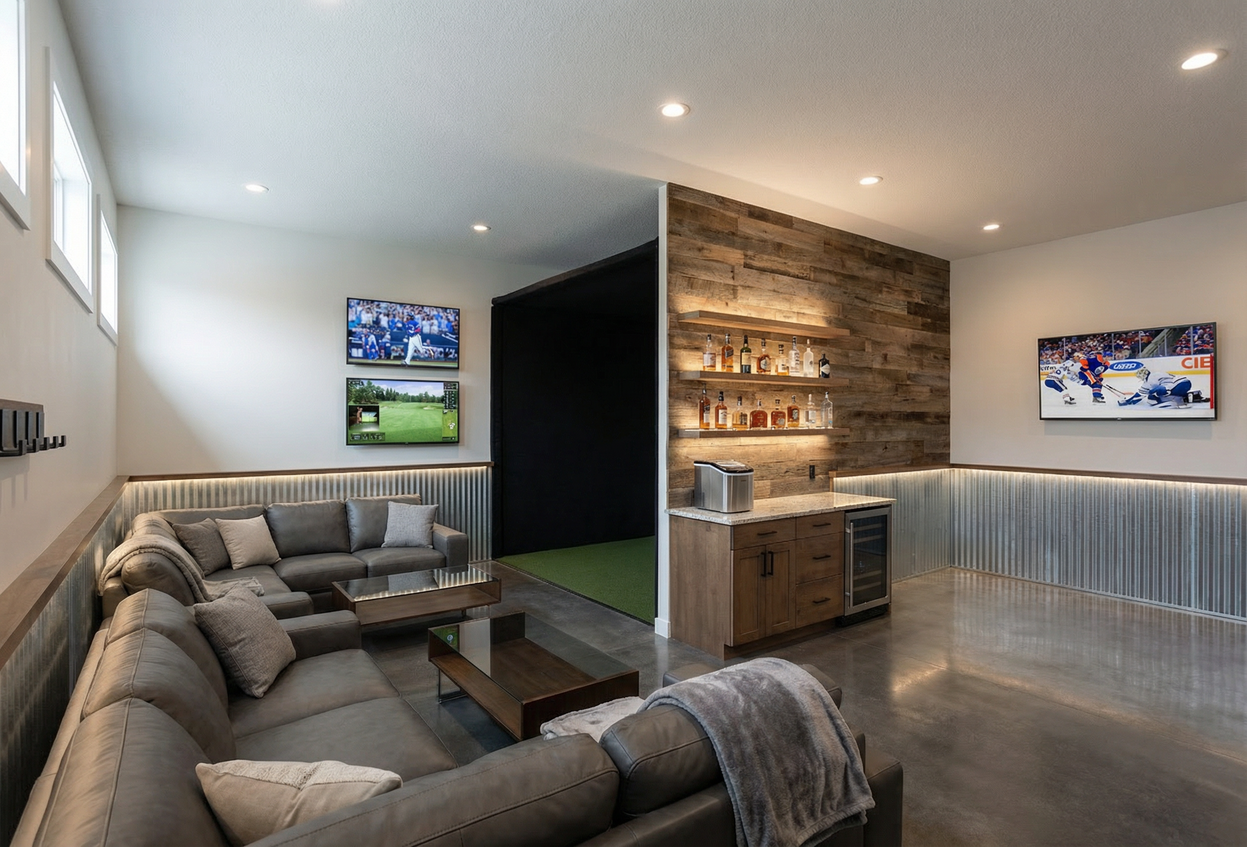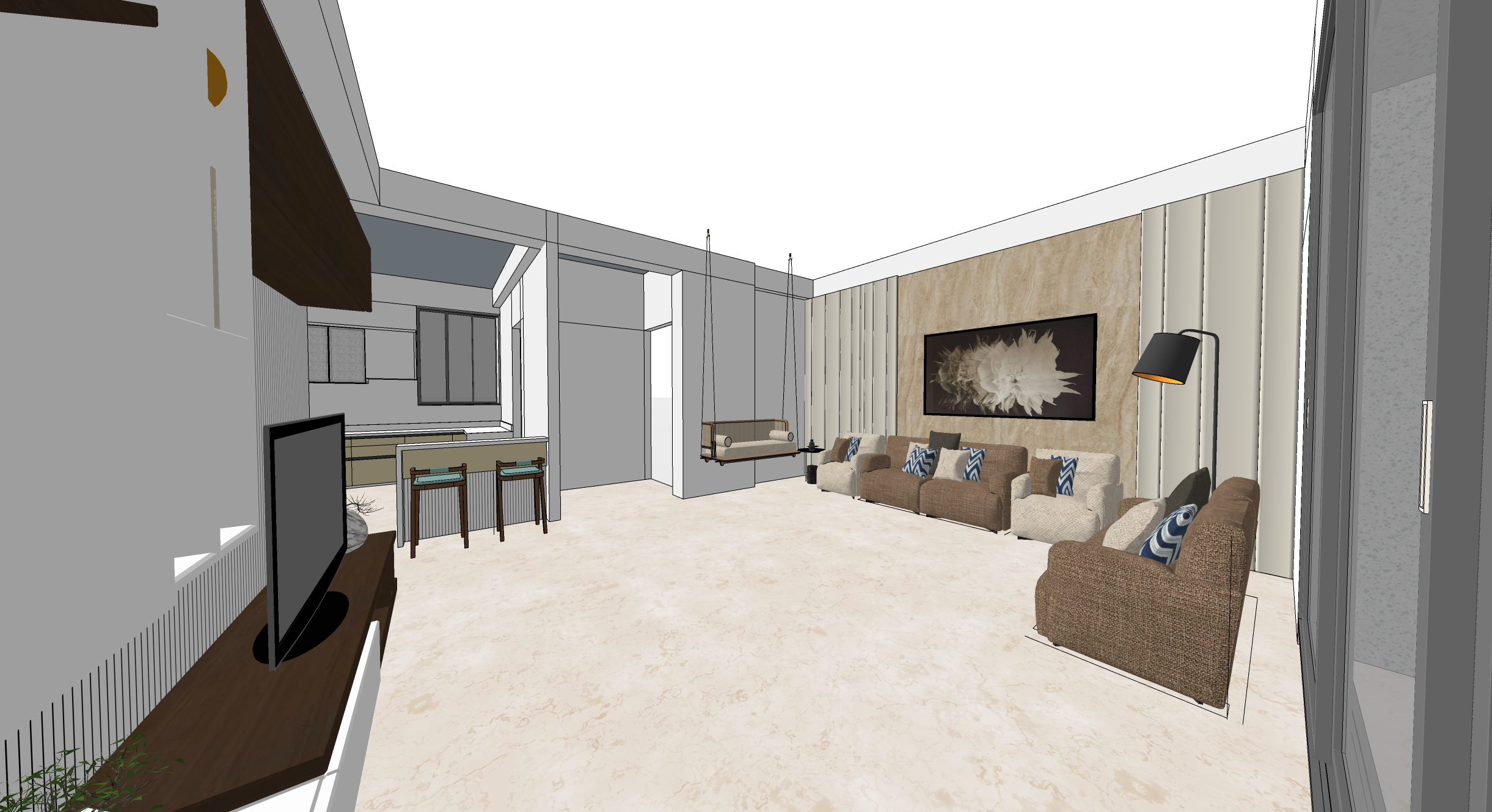 realistic livingroom image with a view of main entrance to the flat and beautiful modern kitchen