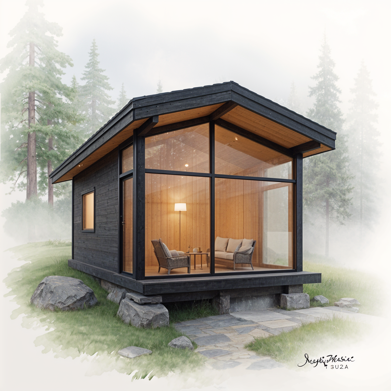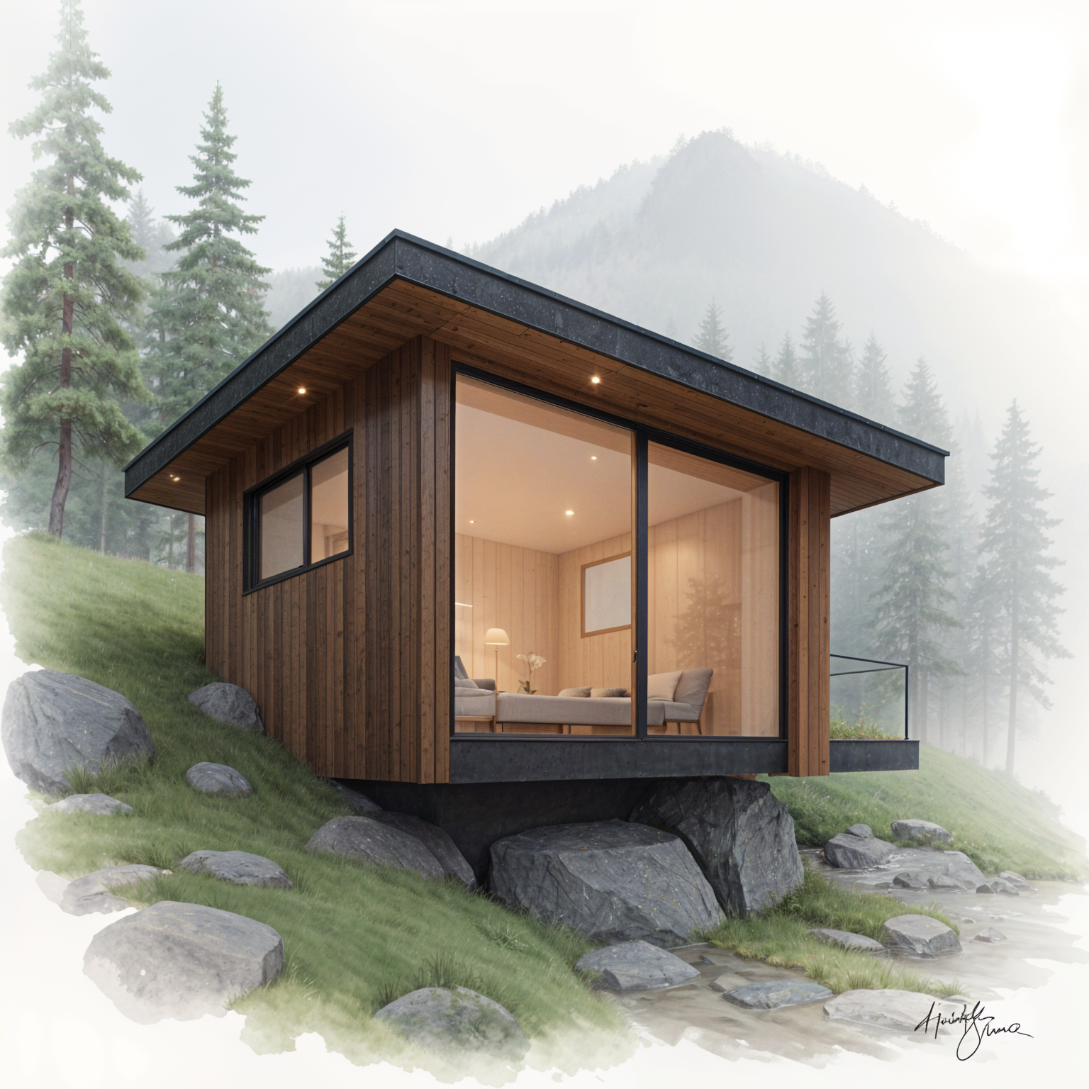 interior watercolor rendering of contemporary dayroom with double high ceilings outside of windows is view of misty forest skyline with cozy funiture and futuristic stairs with handrails
