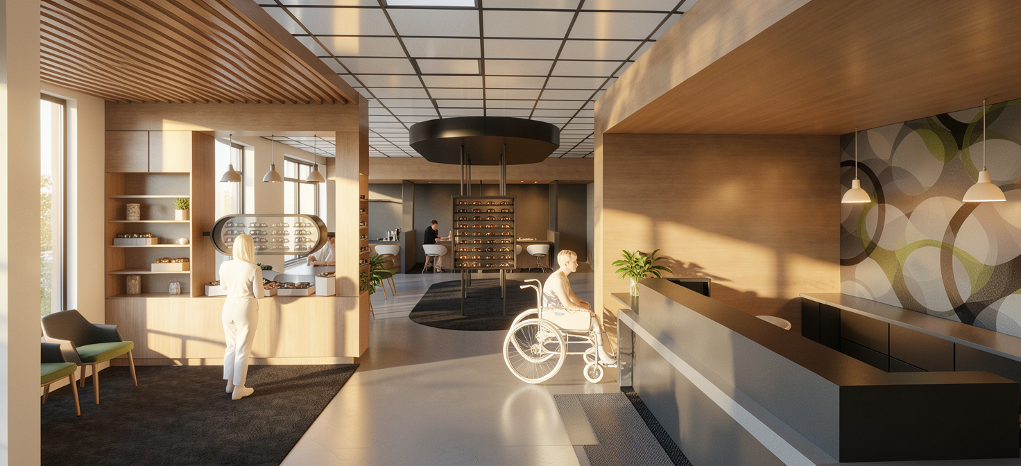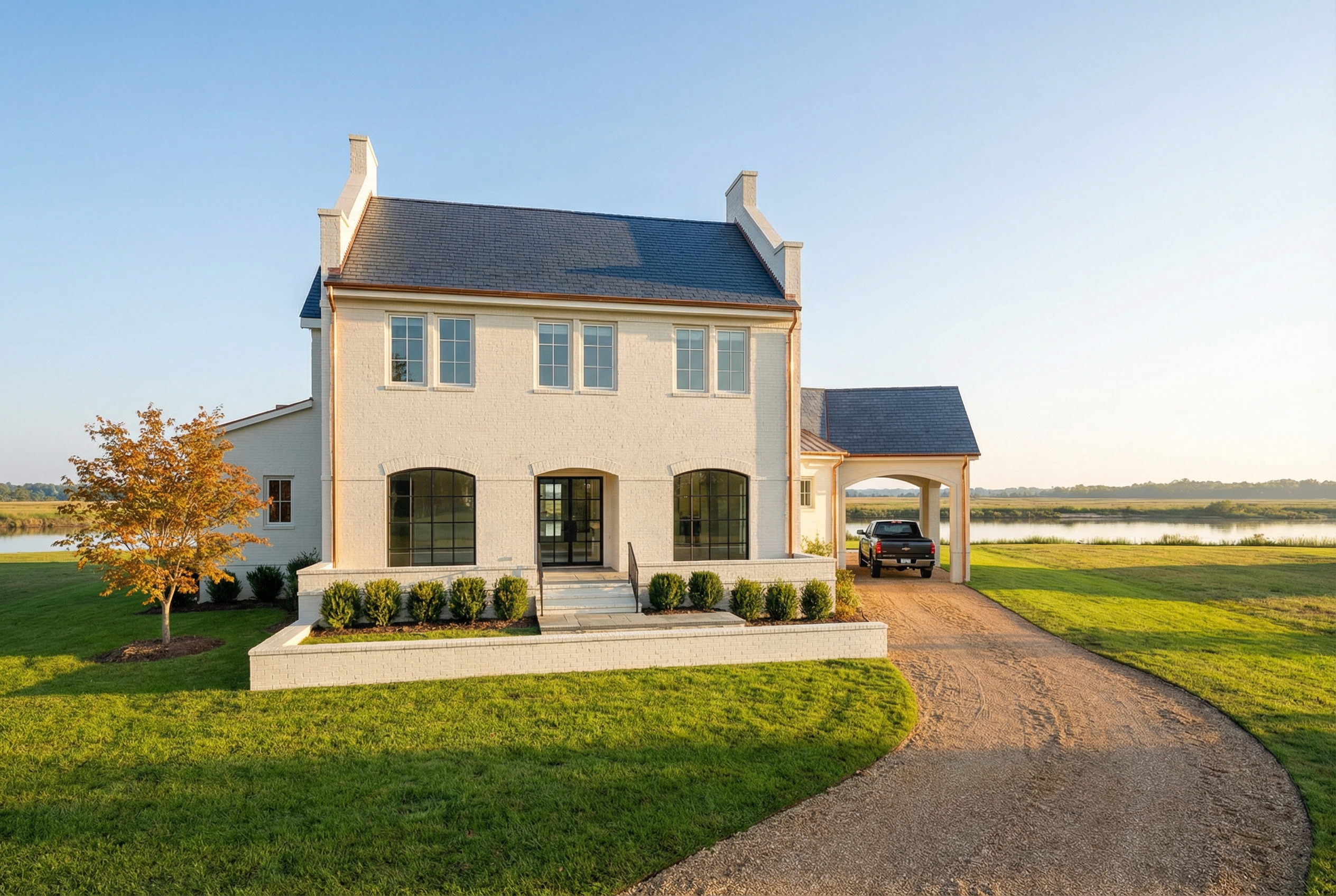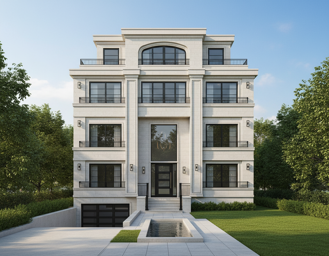 black framed windows contemporary style stucco with modern accents add some mature trees in the background add a walkway to the steps add a driveway to the garage door give the building a modern limestone look add some ornaments add more limestone detail to the building make it early afternoon with a nice sky only make the windows rail door garage and light fixtures look black keep the building and the roof caps a light color make the roof caps to match the building color also add an ultra modern flat water feature centered on the right front lawn make sure all of the roof caps are light colored not black