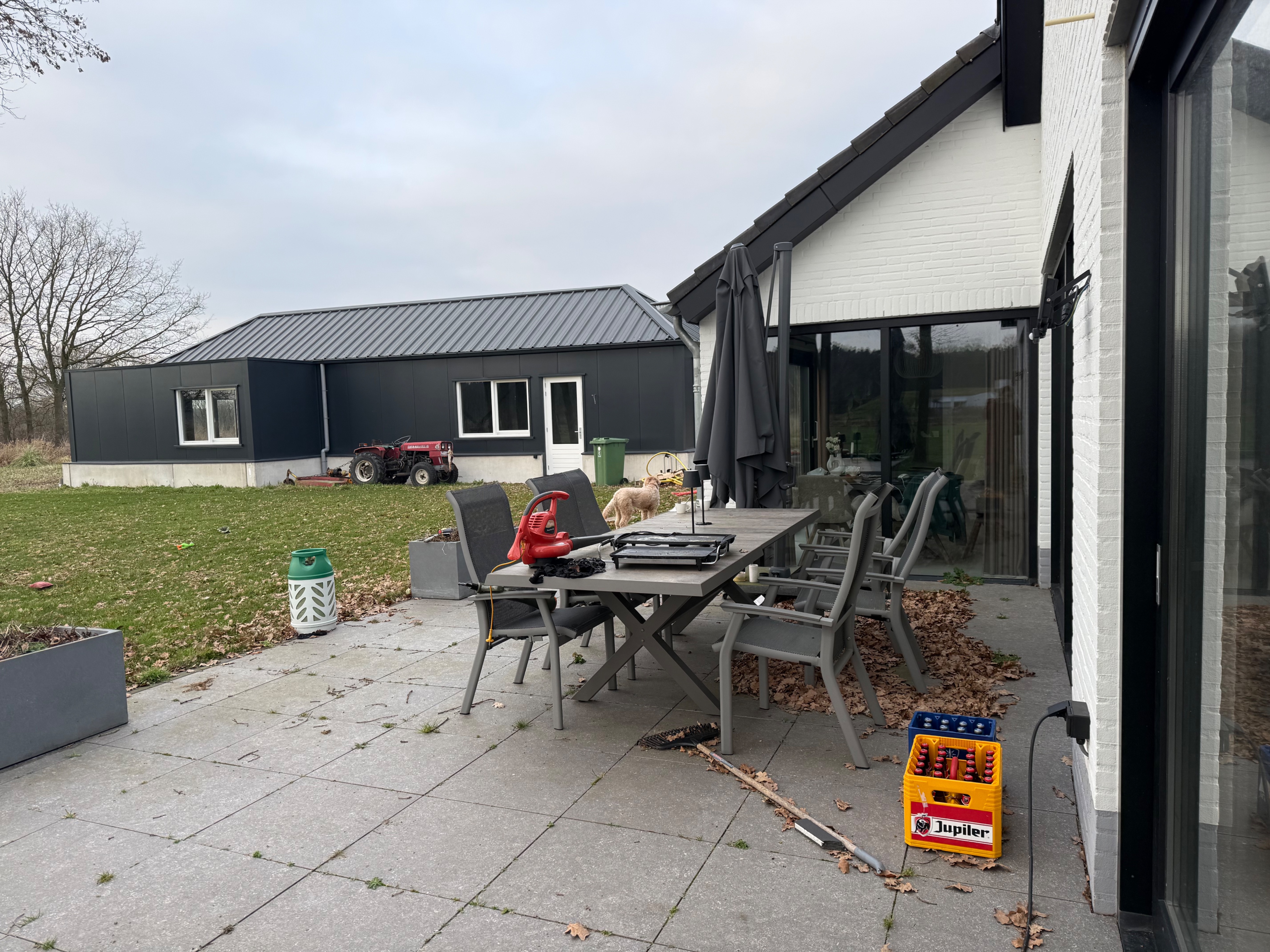 remove the outdoor furniture set and dining table from the patio replace the occupied area with a clean seamless type vloer bijv large grey natural stone tiles that perfectly matches the surrounding terrace ensure the perspective lighting and shadows are consistent with the existing architectural photograph high end architectural visualization style