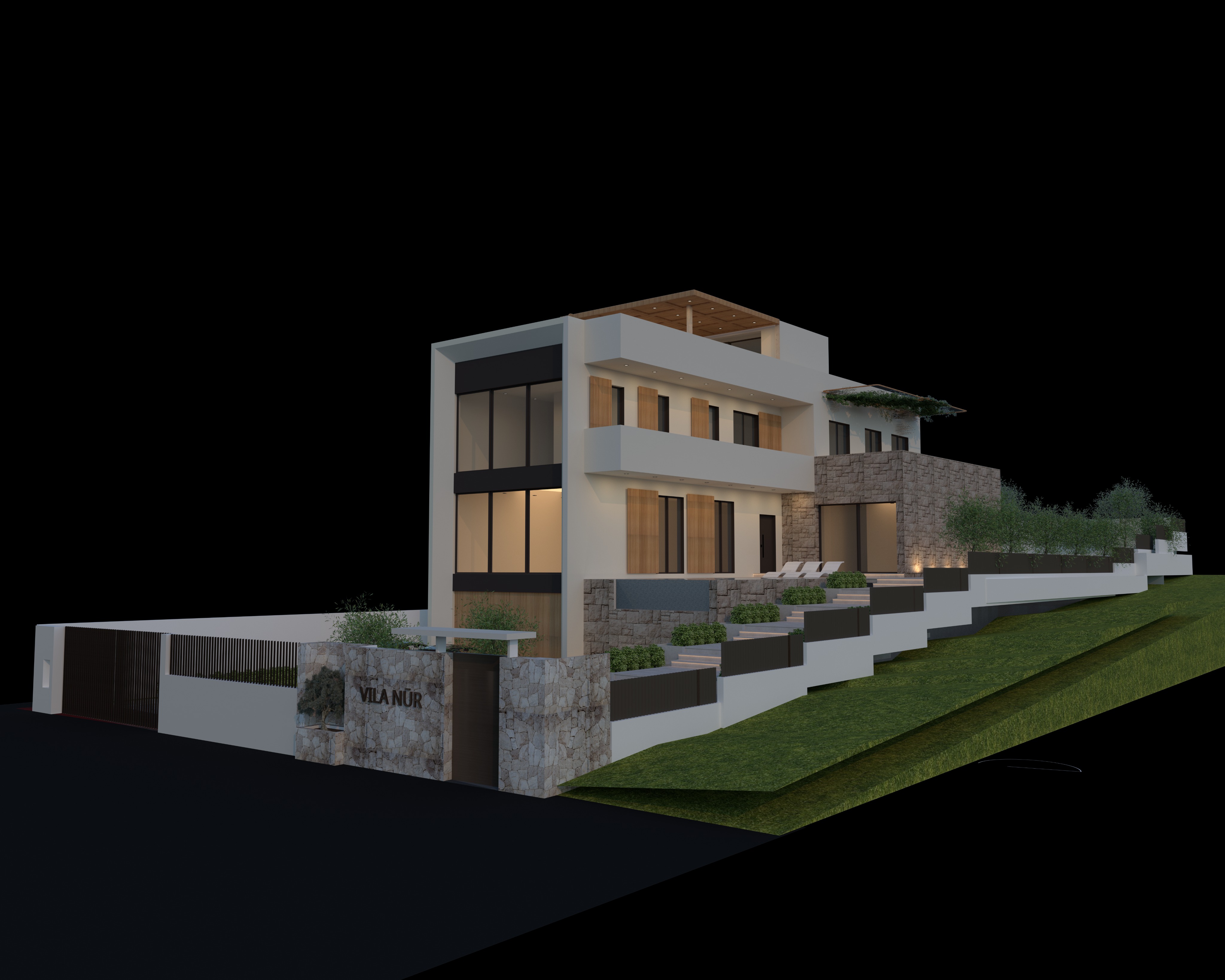 render sa me realist me ndricim te brendhem te ambjenteve peme mesdhetare si ulliri sa me realiste ndertesa eshte e lyer me ral 9010 dhe pjesa bakoore me e larte me faqe te pjerreta ku jane edhe vetratat e medha eshte me material metalik ral 9010 dhe ral 8019 ne sfond shto nje palazine qe eshte 3 kate po beje transparente palzinen te jete 30 e dukshme dhe shto 1 makine ne rruge