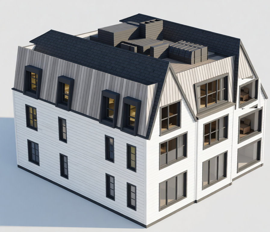 keen app the same but make top of gable white not grey and the 3rd floor window in right gable make a smaller recessed in deck