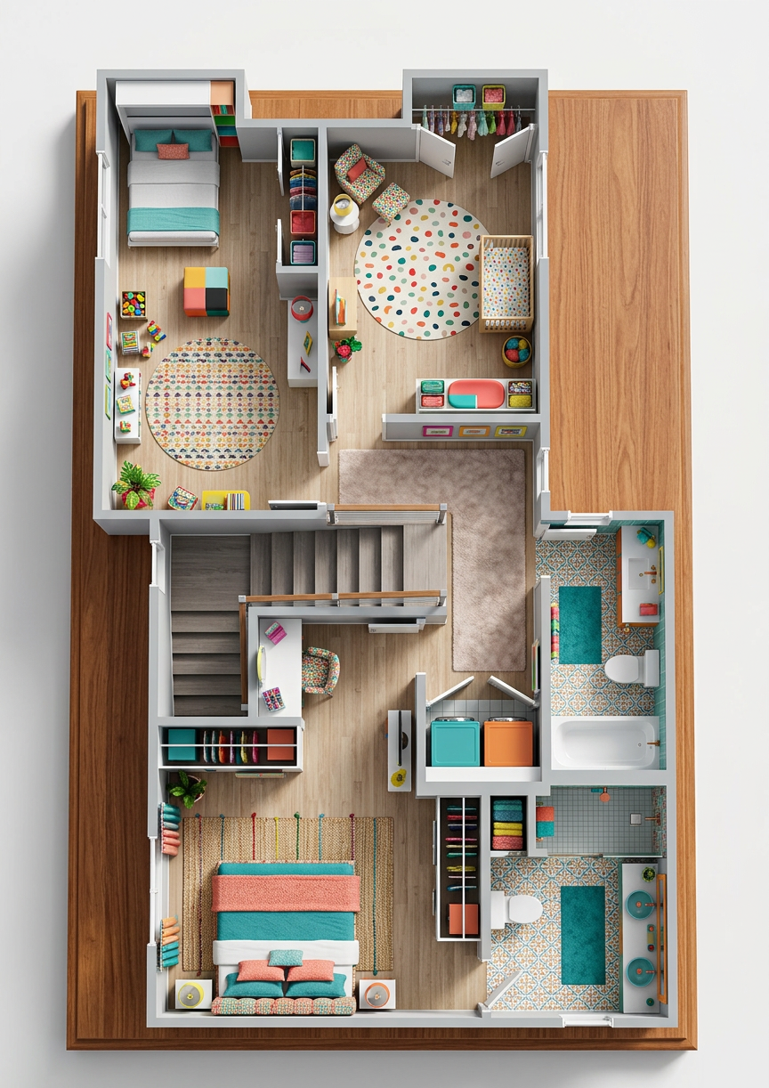 convert this floor plan into a realistic isometric 3d view of a full house show the space from an elevated angle with furniture walls and details visible update this floor plan by replacing the colorful style with a modern classic aesthetic in light neutral tones and warm wood accents in the guest room left side bedroom where the wall bed is located include the structural column positioned directly in front of it and represent this column with a white brick finish remove the closet from the guest room in this updated layout use the same furniture as shows on the plan do not change the orientation of the floorplan