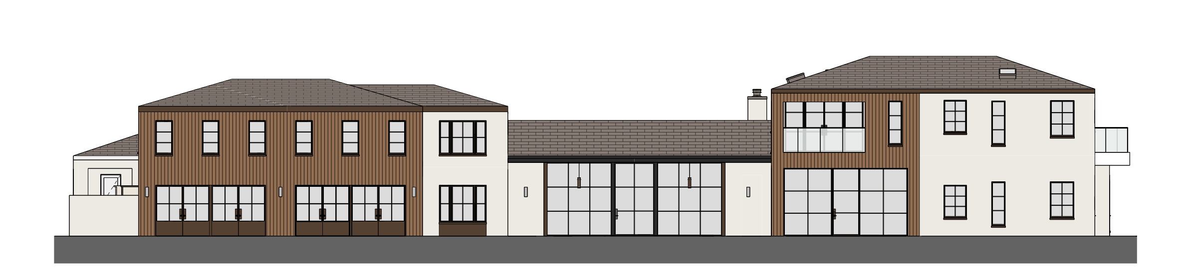 peserve the original camera position and aspect ratio field of view perspective architecture walls openings and all building features exactly as shown do not modify the design or geometry do not modify the material finishes keep steel doors and windows as is make stucco off white color do not change roof material keep white oak wood siding as is
