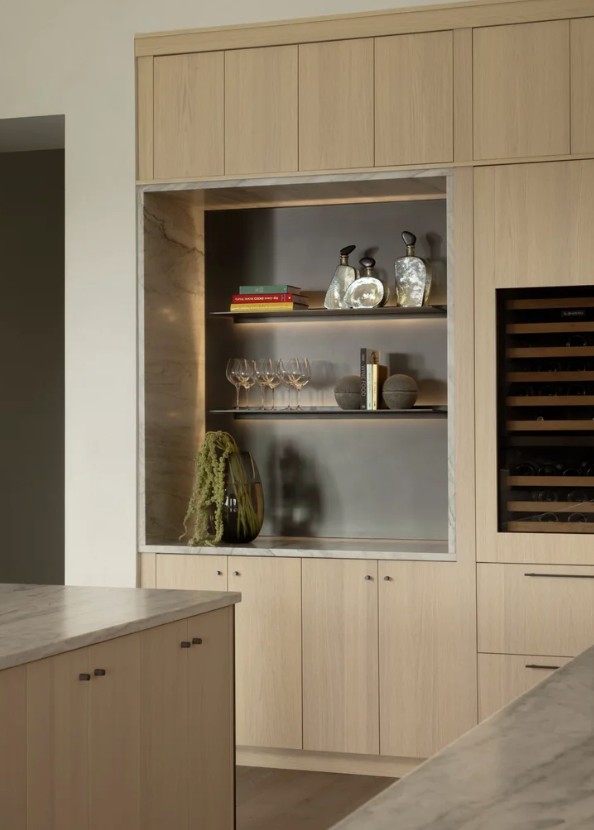 do not change the cabinets in any way preserve the exact cabinet colors materials finishes dimensions door and drawer styles hardware spacing alignment and all geometry exactly as shown do not alter the countertop shape backsplash appliances flooring lighting fixtures or wall structure only remove the construction materials clutter and mess from the scene clean the room and make it look finished and staged add a few simple tasteful home accessories appropriate for the style of the space but do not add or remove any furniture windows or architectural elements maintain the original lighting direction and realism enhance clarity and polish the photo while keeping the cabinetry and room design completely unchanged do not alter the lighting to keep the cabinet colors as they are in the image remove the accessories and restage for a luxurious kitchen put a patio door on the left with a view
