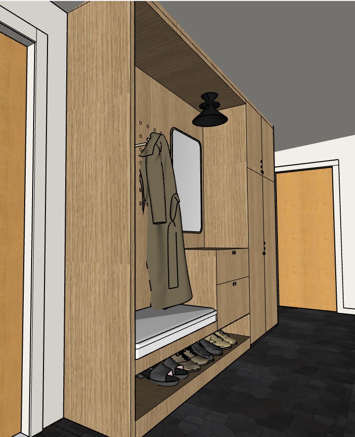 photorealistic architectural rendering using the exact geometry and layout from the provided sketchup model maintain the cabinetry layout bench location cubby configuration mirror placement drawers doors and all architectural proportions exactly as modeled do not redesign the architecture interior design style is warm mid century modern cohesive with the adjacent kitchen space the design should feel calm natural and welcoming with rich materials and soft lighting similar to architectural digest editorial interiors materials custom rift sawn white oak cabinetry with vertical grain mid to light natural oak tone matte finish with warm honey undertones flat panel cabinet doors and drawer fronts in a clean mid century modern style integrated mudroom bench in matching white oak with a light neutral upholstered seat cushion in textured linen or wool open shoe shelf below the bench in matching oak matte black coat hooks and cabinet hardware black metal pendant or sconce light centered above the mirror simple rectangular mirror with thin black frame dark slate or basalt tile flooring with natural variation and matte texture interior doors in warm natural wood tone lighting golden hour lighting entering from the left side of the space creating soft highlights across the oak cabinetry and warm shadows include soft warm interior lighting from the overhead fixture above the bench lighting temperature should feel warm 2700k to emphasize the warmth of the wood avoid bright overhead lighting or overexposed daylight photography style professional architectural digest editorial interior photography cinematic lighting soft shadows realistic material textures and balanced exposure use a 24mm architectural lens with natural depth and perspective typical of magazine photography the image should feel warm cozy and lived in not sterile or overly staged styling subtle mudroom styling including a hanging wool coat leather boots and casual shoes on the lower shelf a canvas tote bag a small woven basket neutral textiles on the bench cushion negative instructions avoid overexposed lighting avoid glossy cabinets avoid modern white cabinetry avoid bright contemporary styling avoid changing cabinet layout or proportions preserve the architecture and cabinetry exactly as modeled