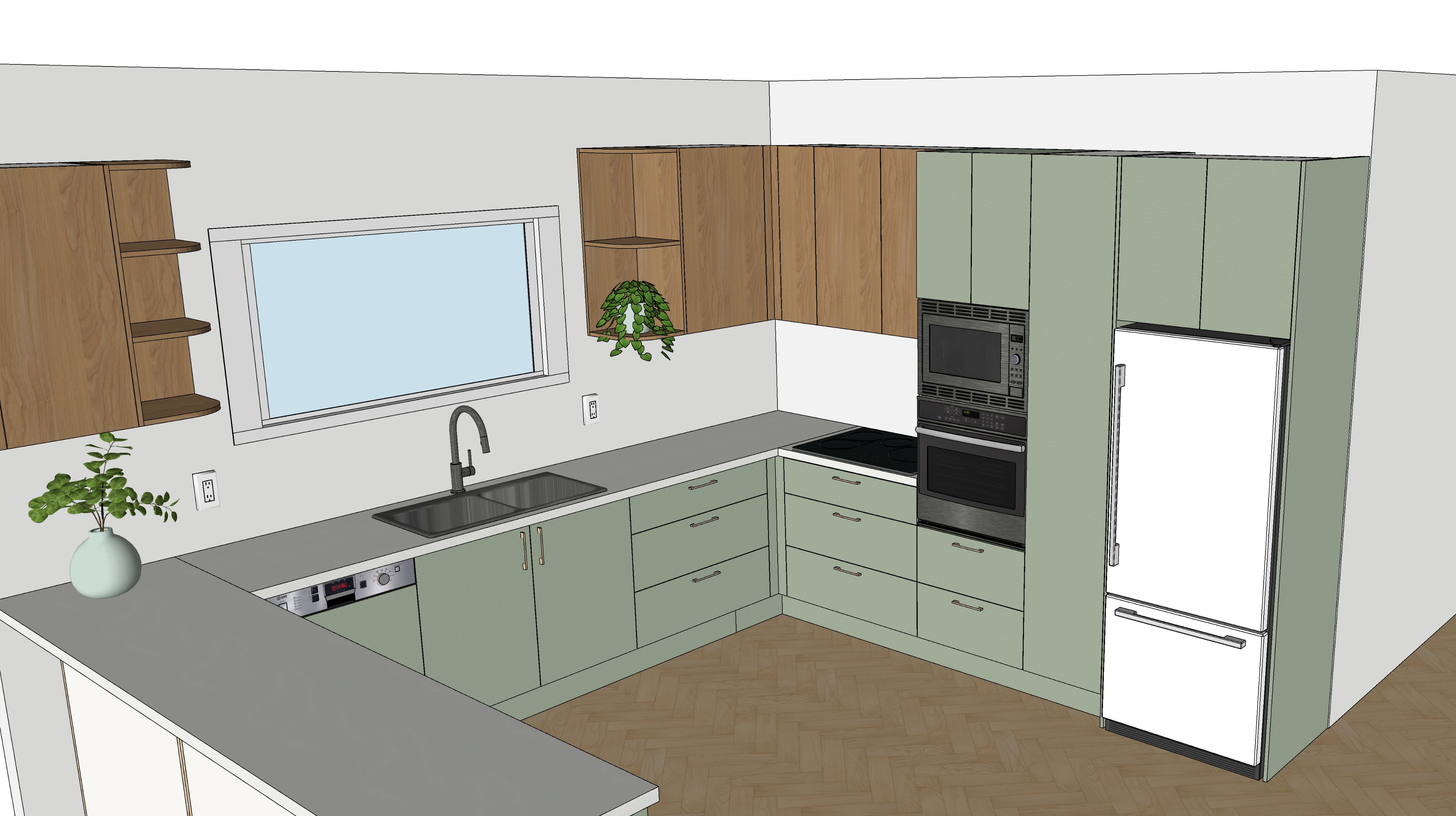 add someadd some cook books to the shelves on the left and any other dectorative items to make it beautiful make the view out the window grass mountains in the distance make the bench top a white stone add a handle to the pull out pantry next to the fridge