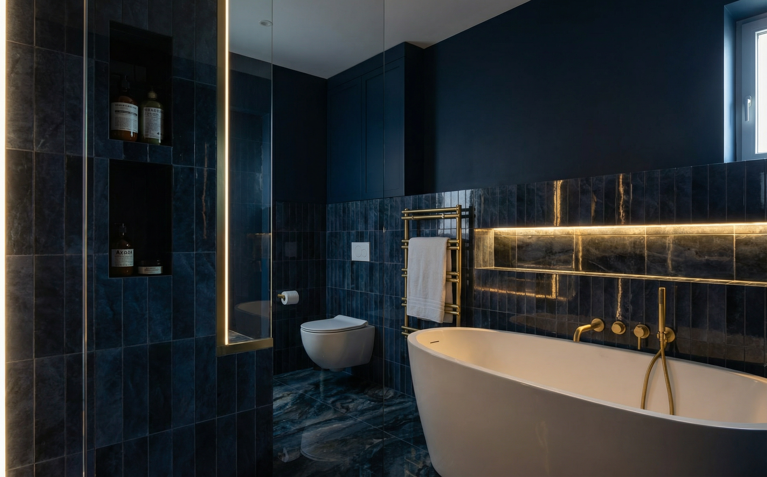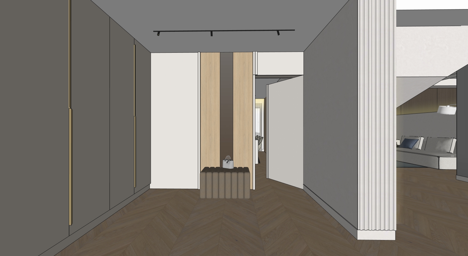 create a render in hyper realistic architectural visualization quality 8k resolution all objects furniture sanitary ware and architectural features must remain in place do not add any objects or delete anything from the image the spatial configuration must remain unchanged warmth gentle reflections soft shadows enhanced color richness and luxurious level realism improve depth and realism through wood grain richness brass highlights fabric boucle texture and polished clarity while keeping the entire scene exactly as originally designed use general daylight lighting in the room use a smooth white wall surface