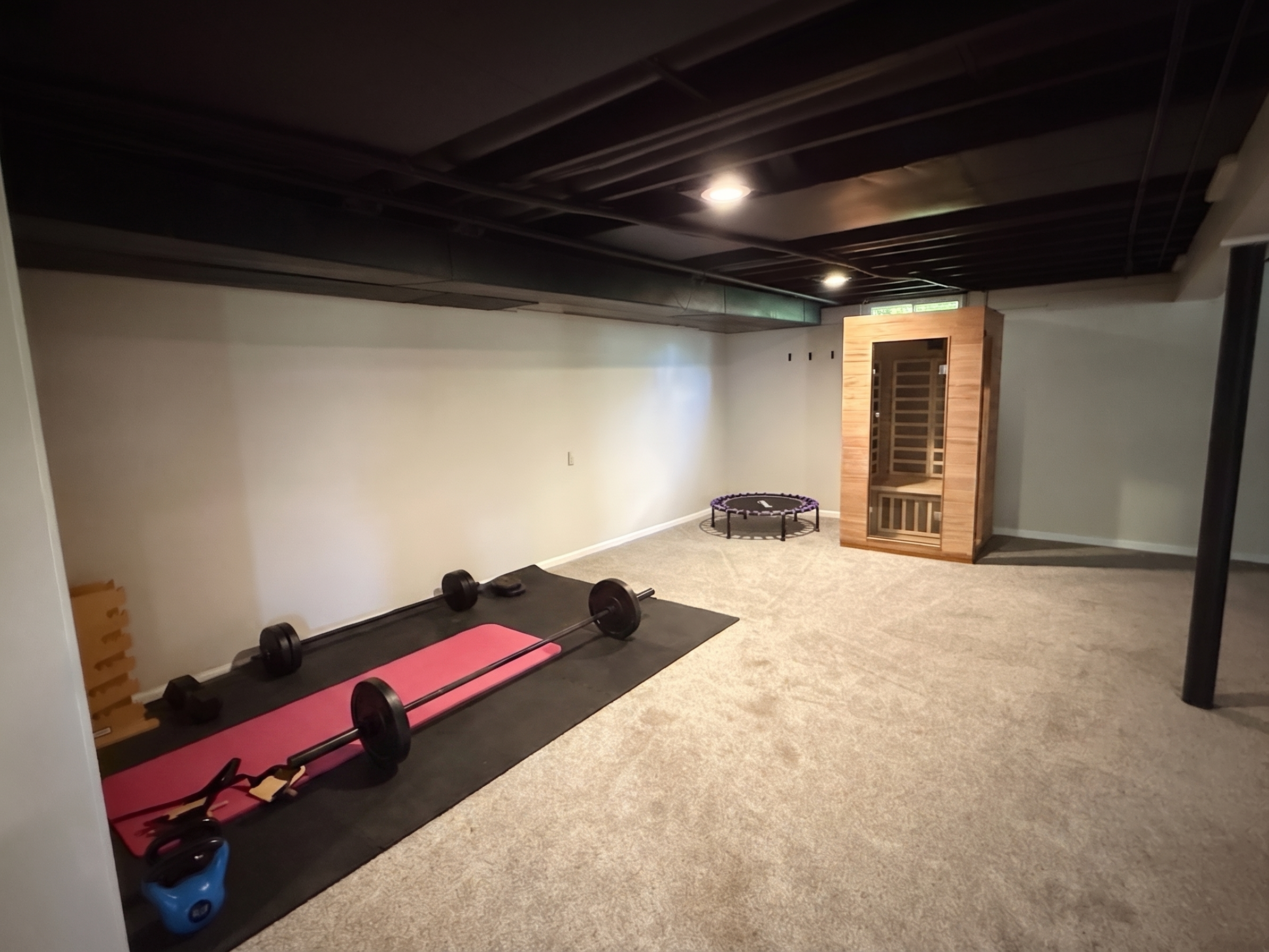 change the wood in this to be painted a very dark gray with a very dark navy teal black undertone through the window add lush landscaping and looking up a neighborhood street on the left is a doorway that leads to a staircase