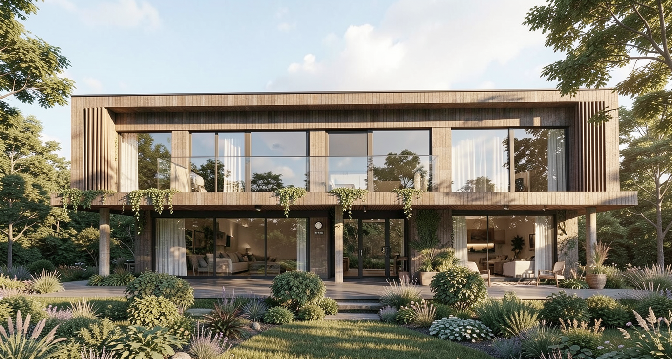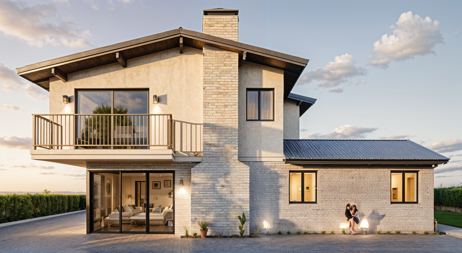 shale grey colorbond corrugate roof gutter dover white fascia dulux silkwort james hardie 180mm linear cladding tallowwood decking lexicon quarter 90mm trims around windows and doors pearl white windows colonial bars lexicon quarter to subfloor bagged render gable end detailing highlighted in lexicon quarter background in silkwort