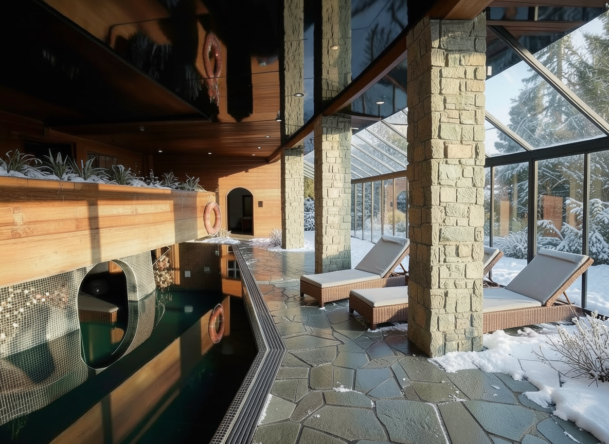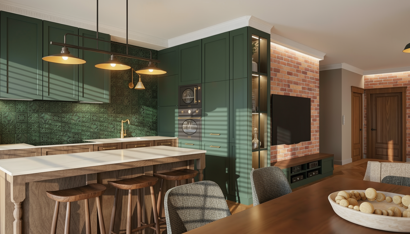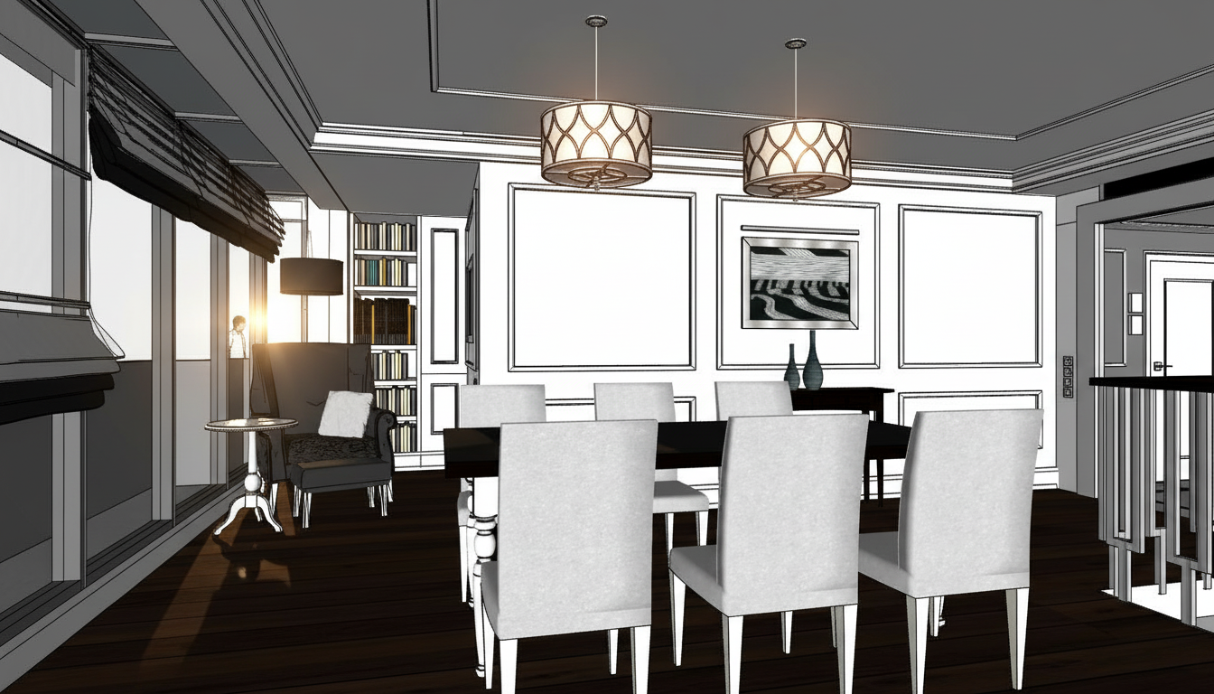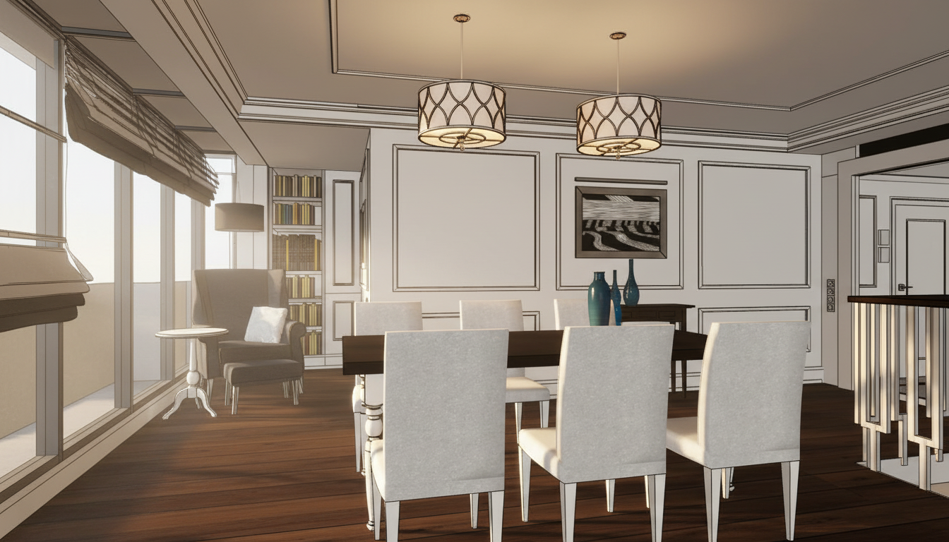 international style interior shot create a nice realistic interior visualization use natural materials and maintain correct scale and proportions use physically accurate lighting with soft global illumination and high quality textures ensure precise details with realistic reflections and shadows the lamps are turned on and emit warm light with visible light sources keep natural exposure a nice view is visible through the window do not add stylization or artistic effects the result must be photorealistic architecture