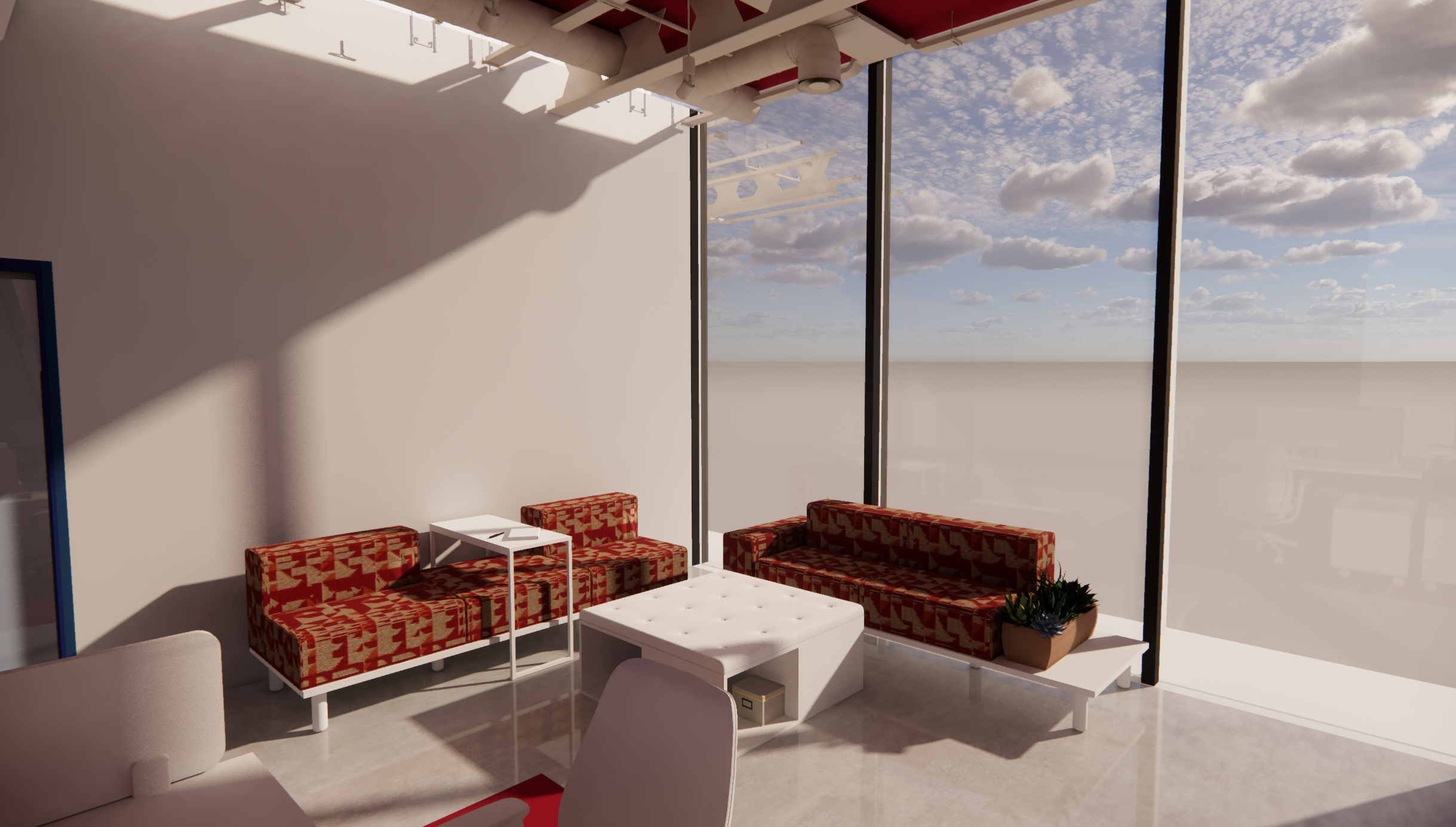 make the location outside the windows downtown albequerque new mexico add lights to the ceiling and add the silhouette of a person sitting on one of the couches