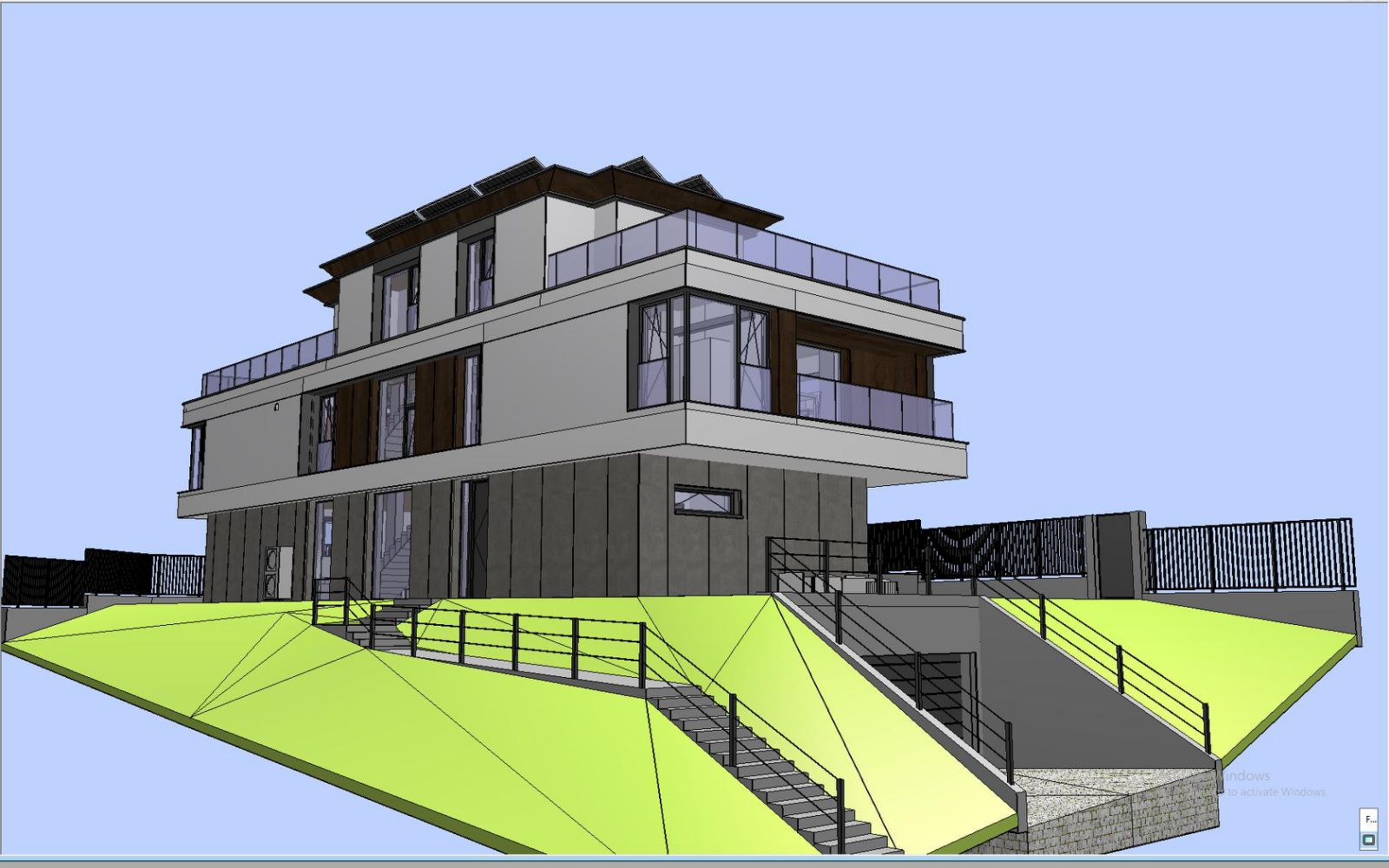 exterior shot use environment and materials from the mood board add road in front of the garage ramp remove the rail from the stairs and add hedges