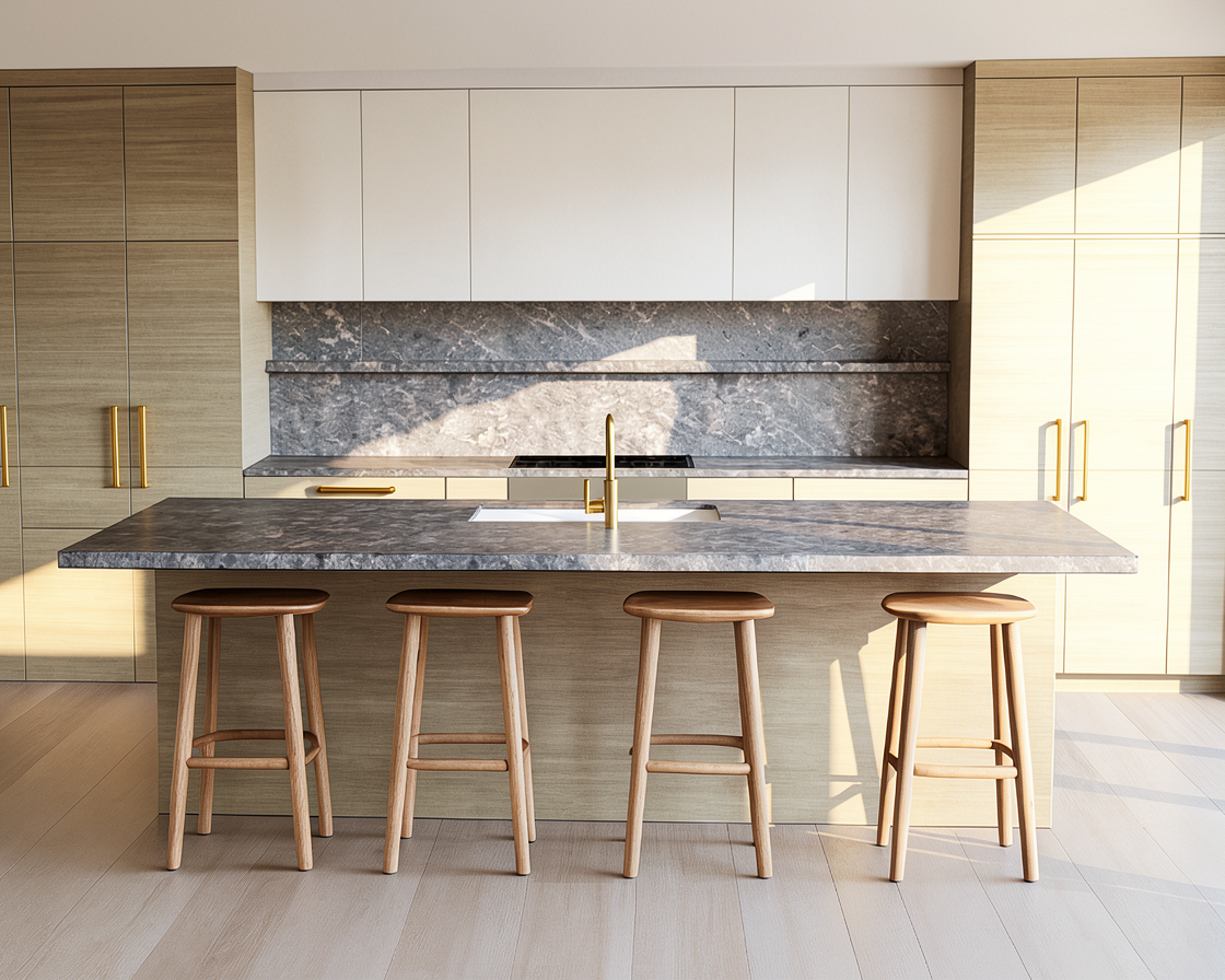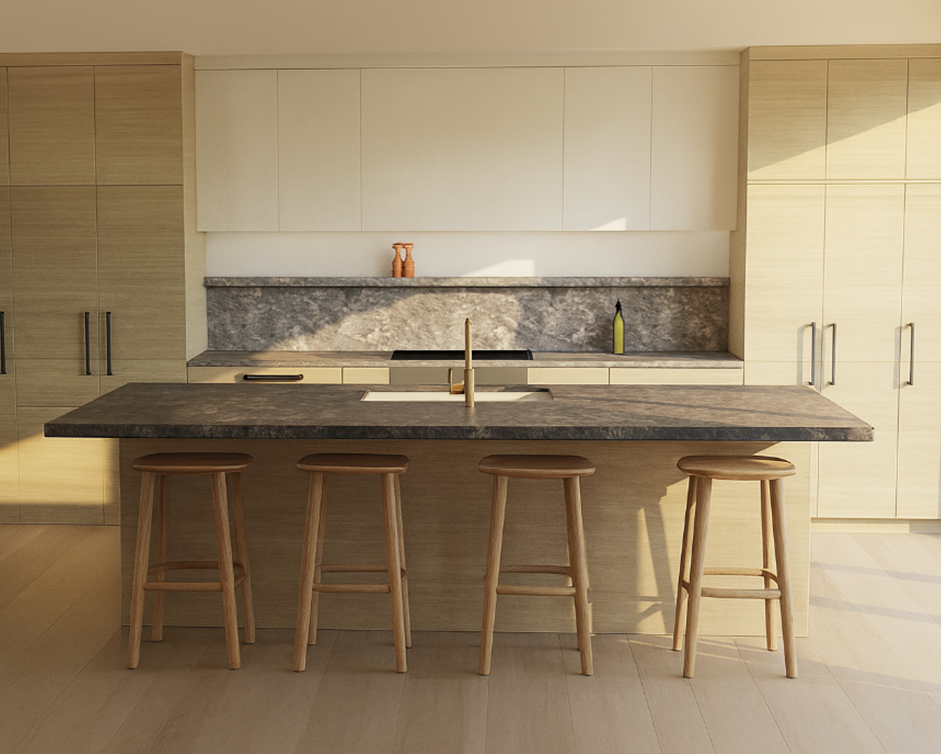 remove the orange salt and pepper shakers and the green bottle remove stone ledge take the stone all the way up to the white cabinets keep wood island base change hardware to dark bronze setting sunlight