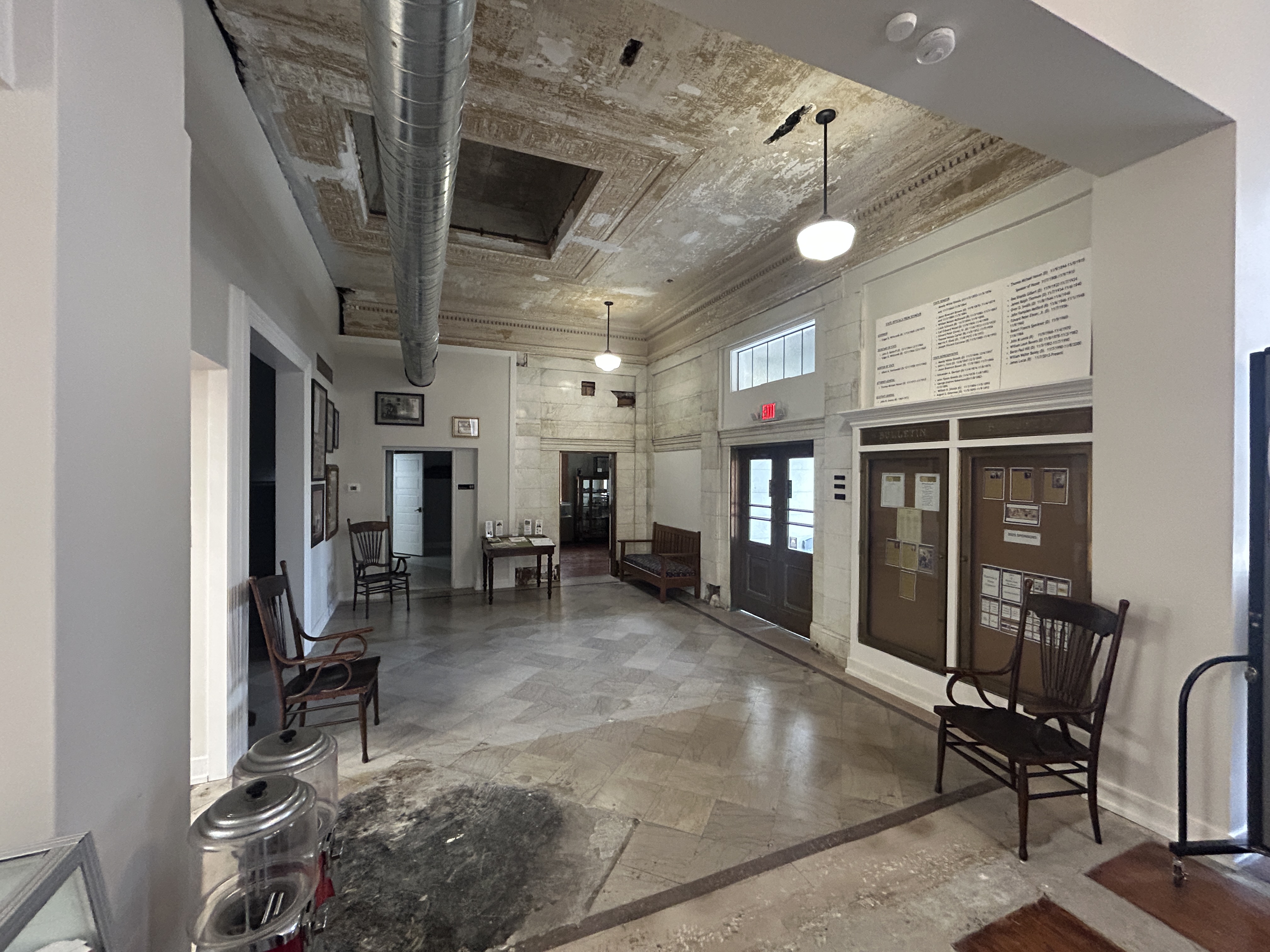make this lobby look refreshed remove the metal duct refresh the skylight in the ceiling add new pendant lights