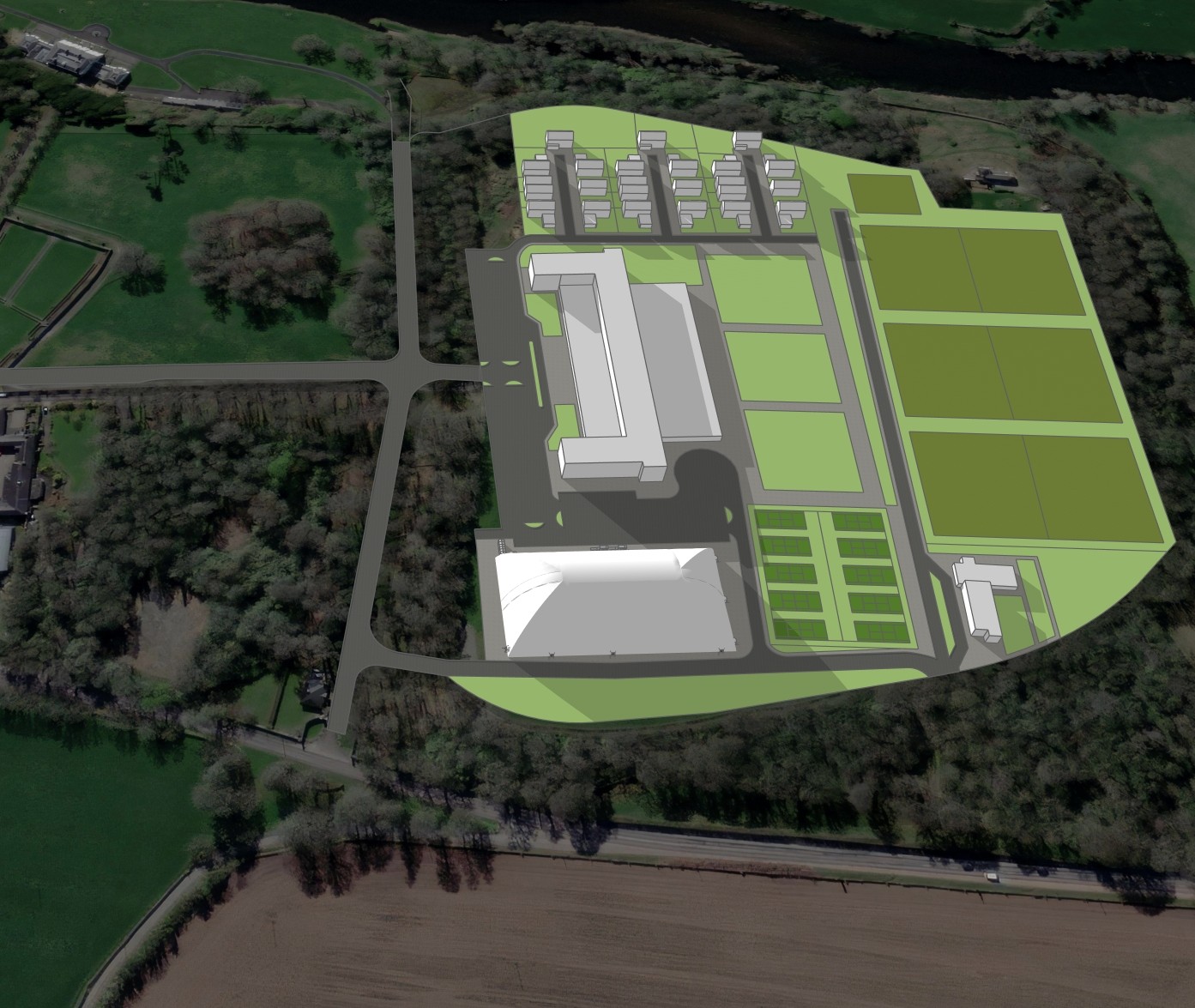 aerial view of a serene landscape blended with a conceptual architectural design render the lush green fields in vibrant shades of emerald and jade the planned structures should be depicted in sleek modern white with subtle silver accents roads and pathways are a polished dark gray surround the scene with a warm sunny atmosphere featuring a soft blue sky with wisps of white clouds add soft lighting to enhance shadows and depth giving the image a harmonious blend of nature and architecture