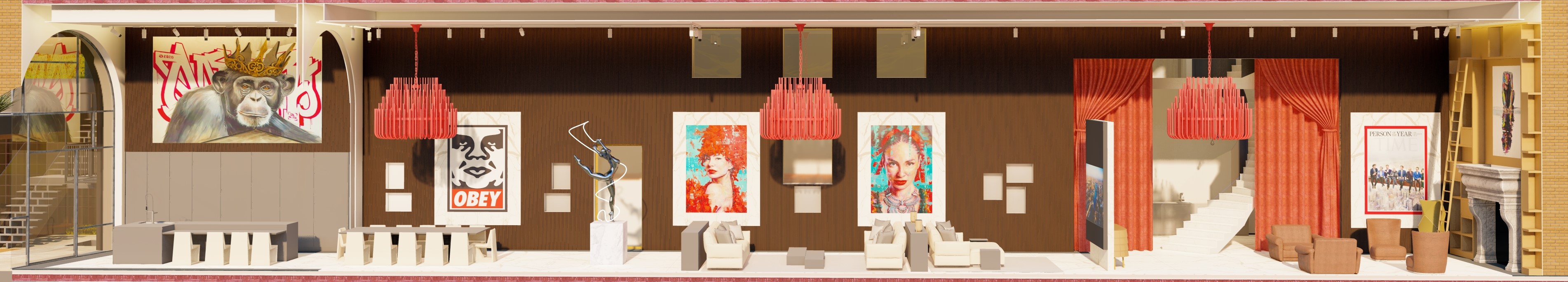 make the view hyperrealistic enhance the reflections but do not modify the textures and the images of the paintings improve the lighting to create a golden hour effect the canopy is made of red velvet it is 5 meters high enhance the velvet effect do not modify the curtain or add any others make the matte effect of the slats on the wall and above the red canopy more realistic the armchairs are by baxter and made of dark brown leather improve the leather texture