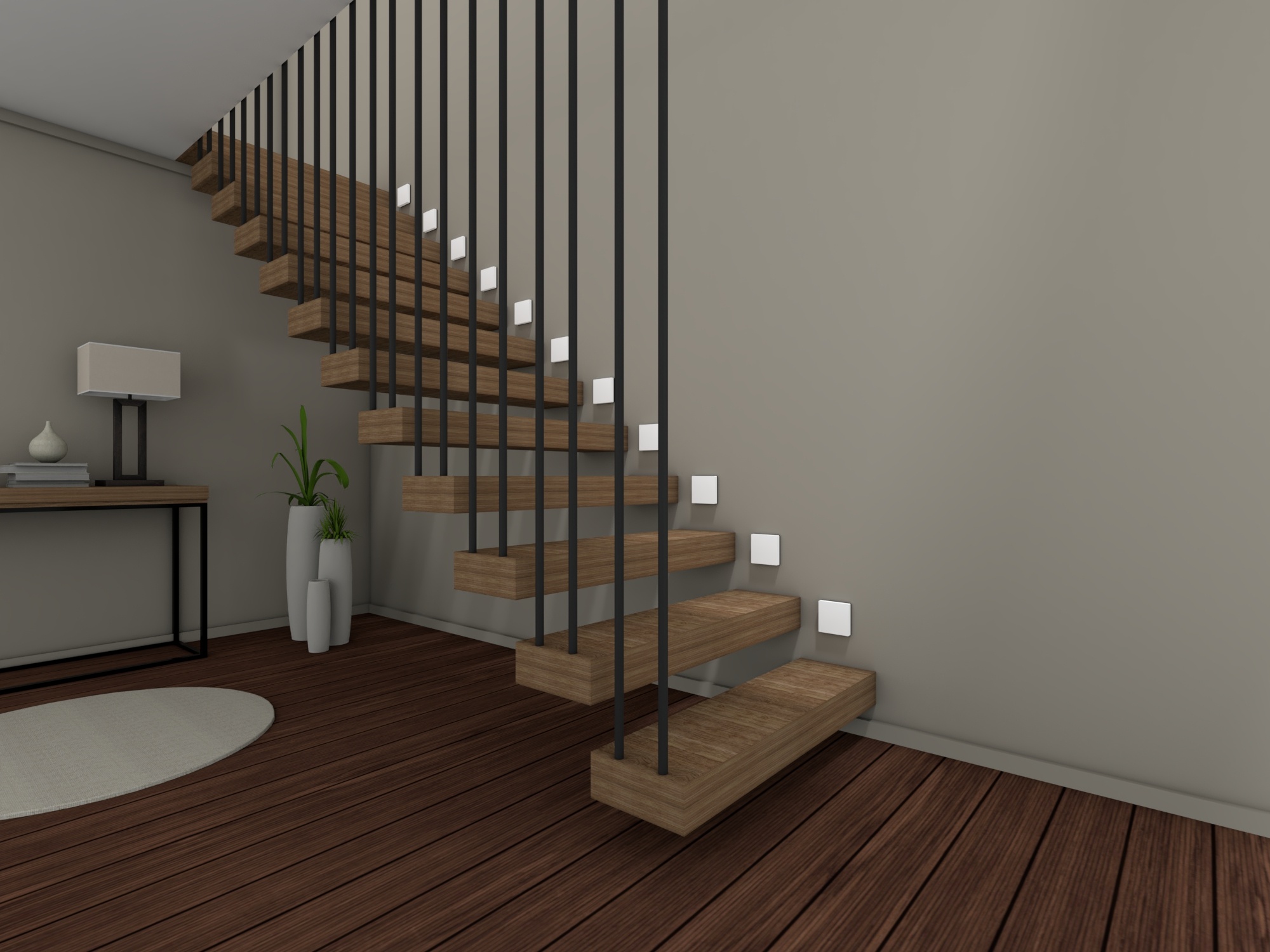 a modern and sleek staircase with an open design the staircase features floating wooden steps giving it a minimalistic and airy appearance the steps are made of rich warm wood with a clean finish and each step is supported by thin black metal rods that create a striking contrast with the wood along the side of the staircase small square white lights are embedded into the wall providing subtle illumination to highlight each step and enhance the overall ambiance of the space the light fixtures add a modern touch ensuring the staircase is well lit without overwhelming the design to the left of the staircase there s a small console table with a simple lamp on top the lamp has a light beige shade and a geometric base maintaining the minimalist theme of the room beside the table there is a large potted plant in a white vase contributing a touch of greenery to the space the floor is made of dark wood planks complementing the warm tones of the stairs a light colored round rug is placed near the console table adding a soft texture to the floor and balancing the overall design the walls are painted in a neutral beige tone providing a calm and cohesive background that enhances the modern minimalist aesthetic of the room architecture