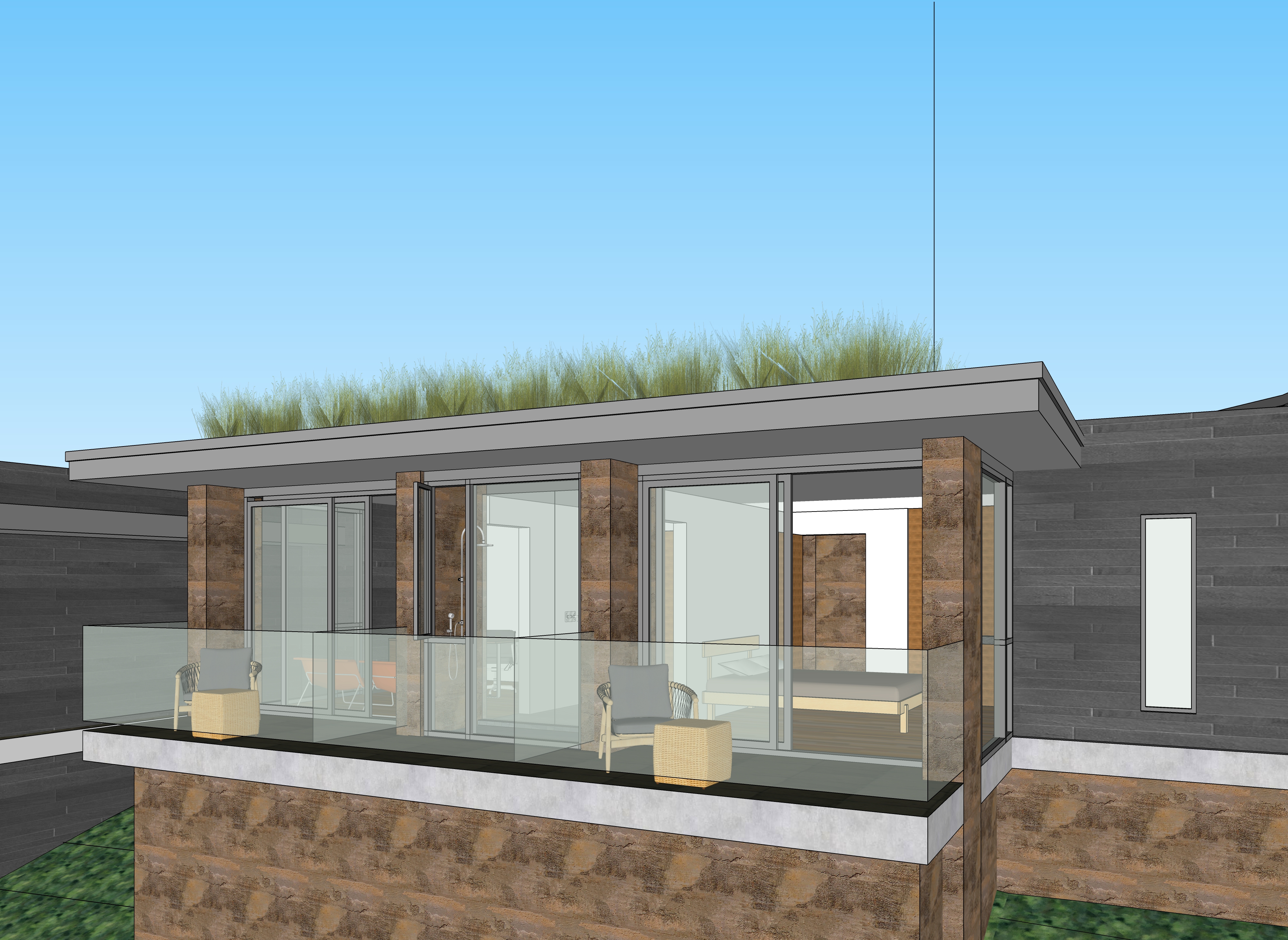 afternoon view lighting use site cast concrete for the main house material with a natural warm clay color enhance the slate gray material from the source image add wild prairie grass to the ground and roof metal flashing on the roof edge the slab edge of the floor is site cast gray concrete
