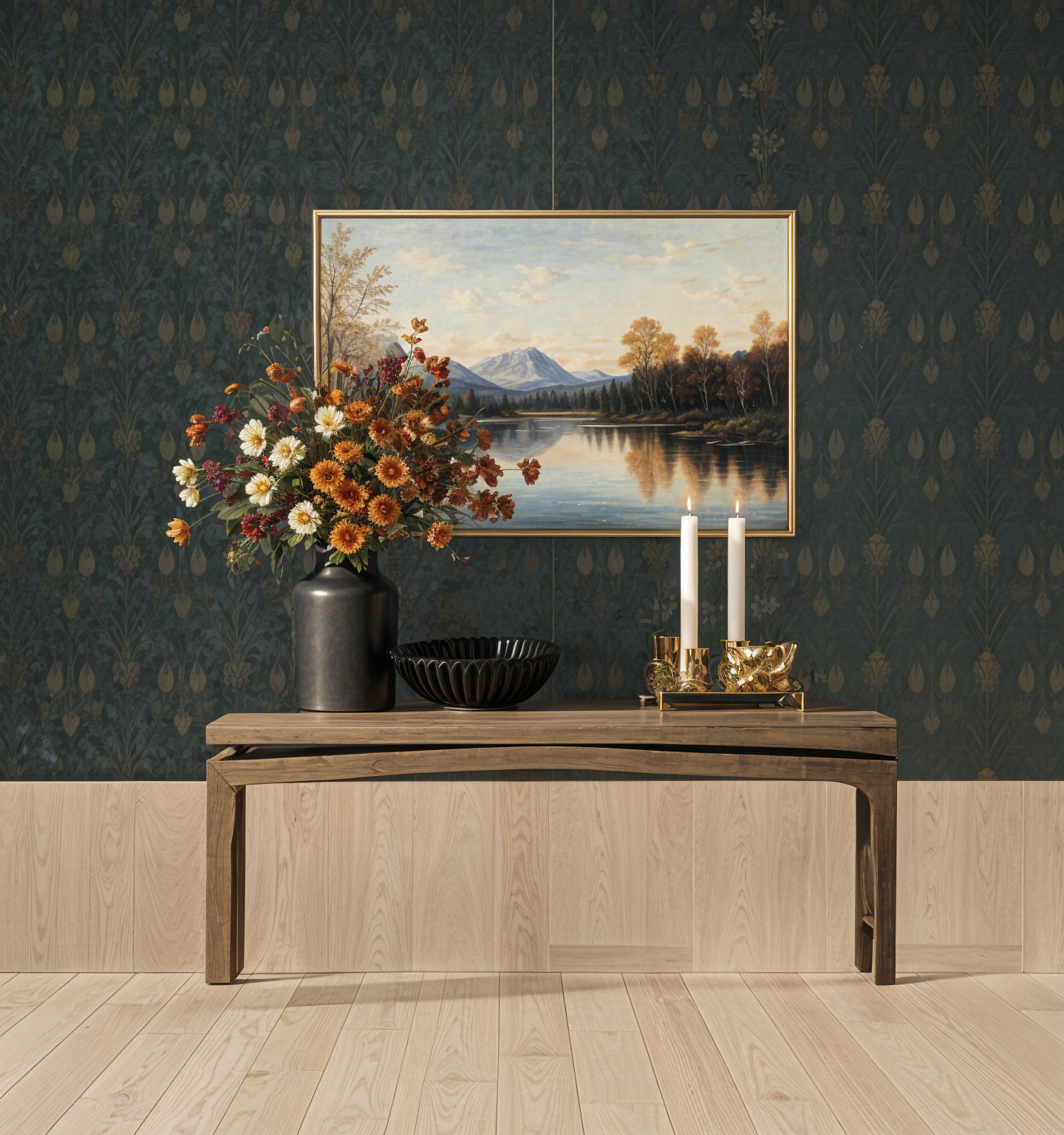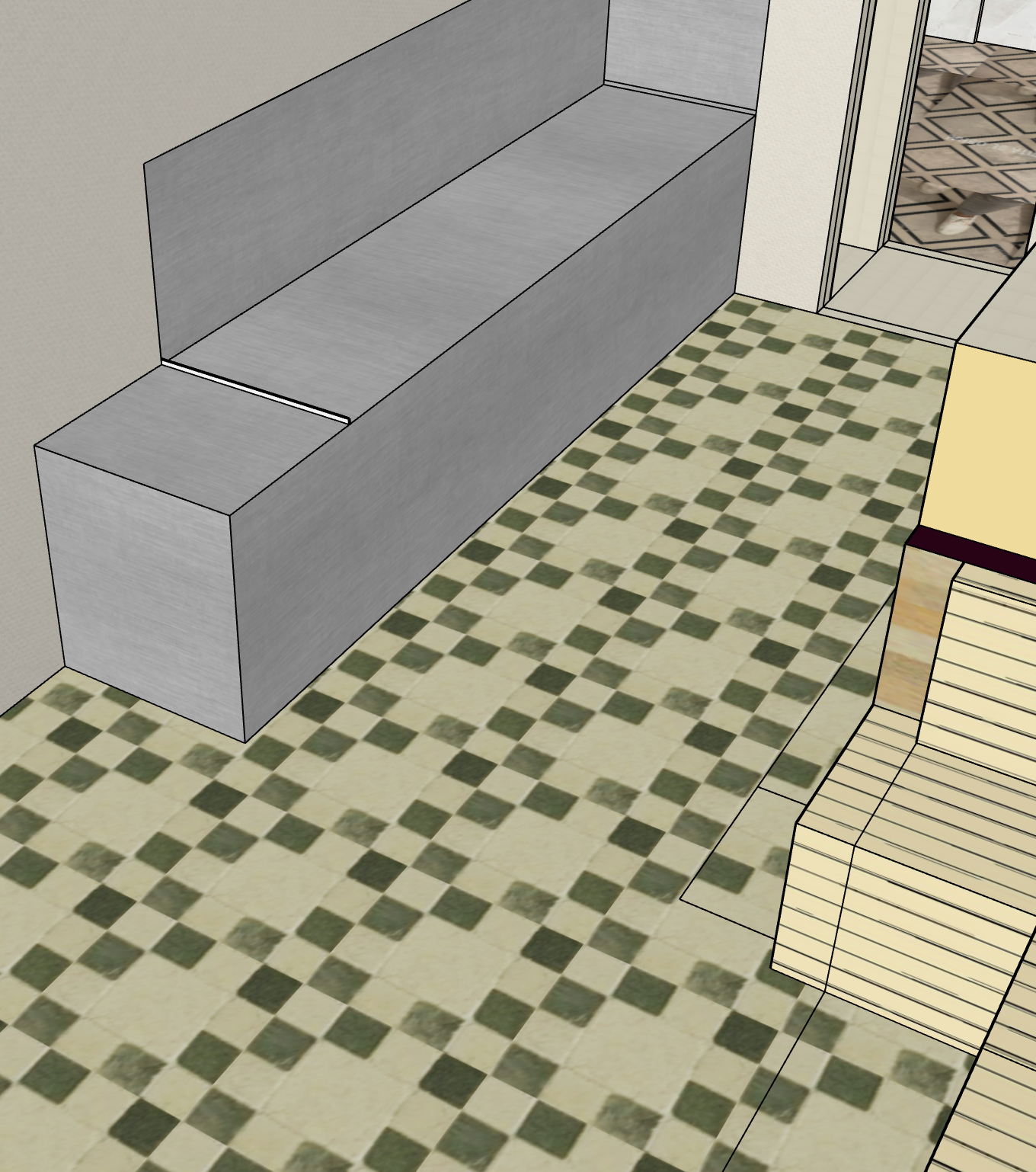 kitchen counter in brushed steel with a sink to add put an orange ceramic plate at the very left of the counter on the bottom left of the picture it is a seating area in striped fabric