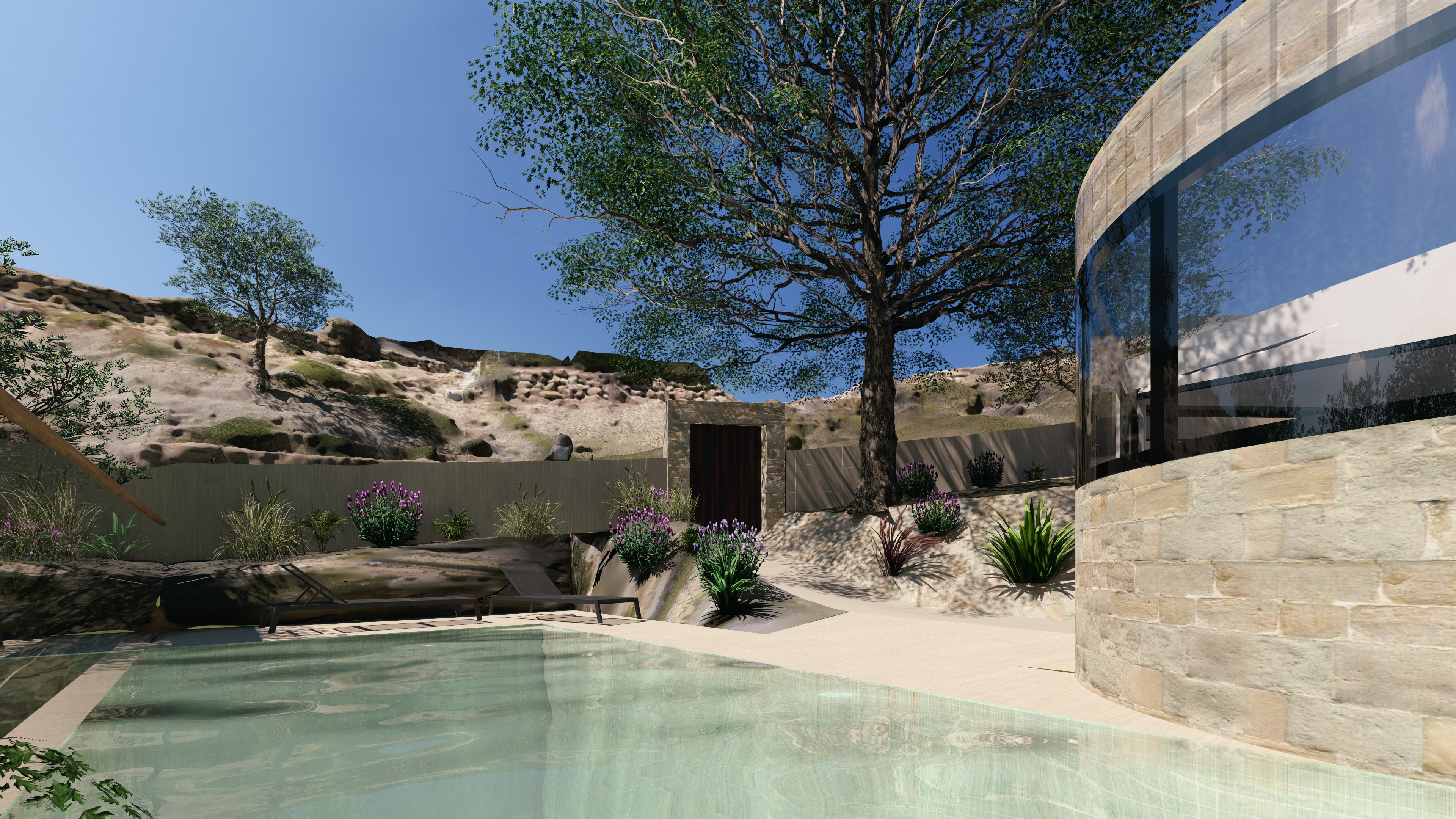 me arreglas esta imagen para que parezca una vivienda de altea hills luxury manteniendo la materialidad del muro perimetral de piedra vista y el suelo de la piscina de baldosa de travertino