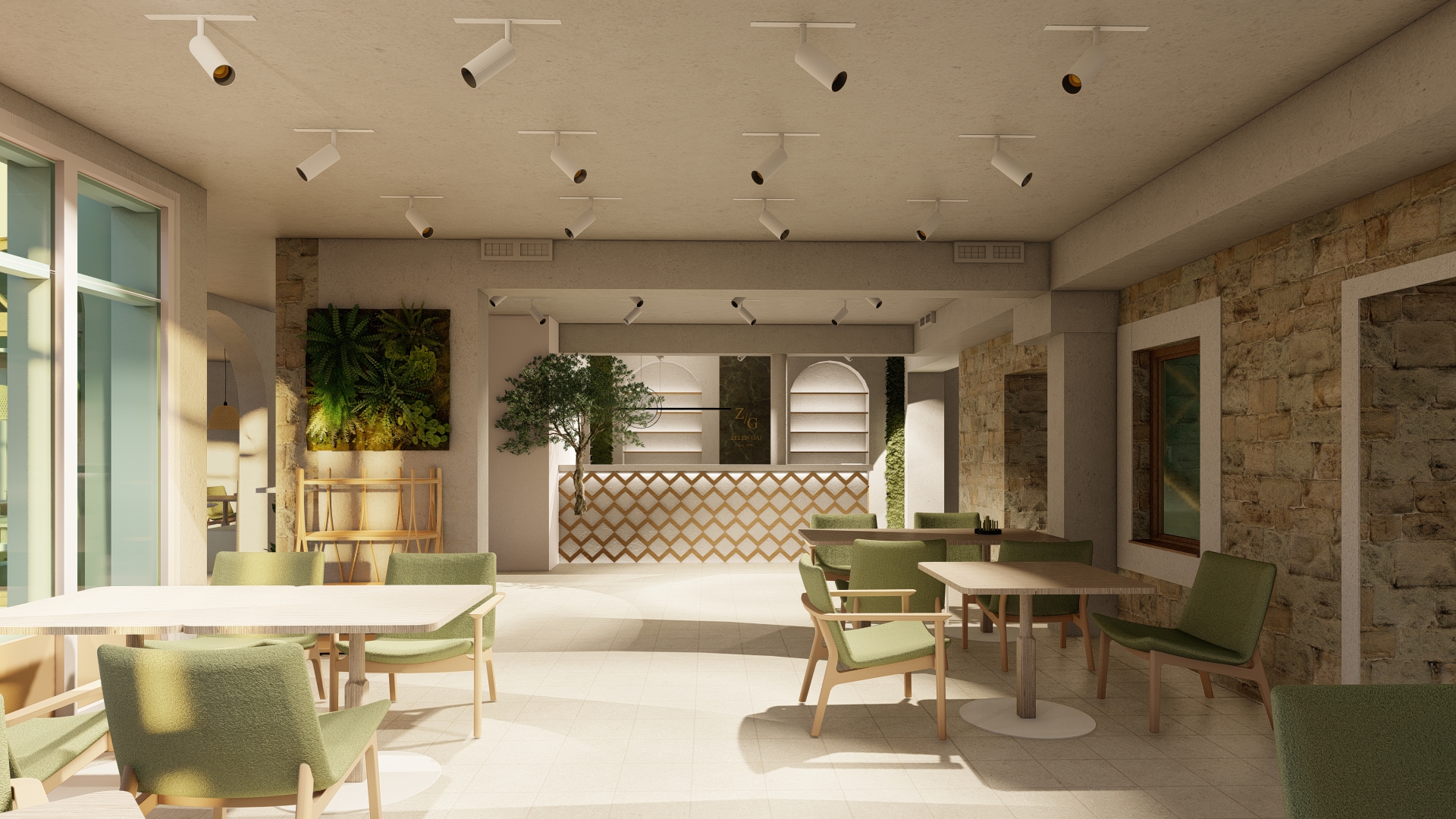 keep the same base geometry and layout do not change walls proportions or structure focus on the bar area make it more realistic warm and atmospheric add more plants especially hanging greenery falling from the ceiling place the olive tree inside a clay pot for a natural mediterranean look fill the shelves with bottles and glasses add small decorations and use soft warm lighting to create a cozy mood do not redesign or move anything only refine the bar area with more realistic materials lighting and mediterranean plants