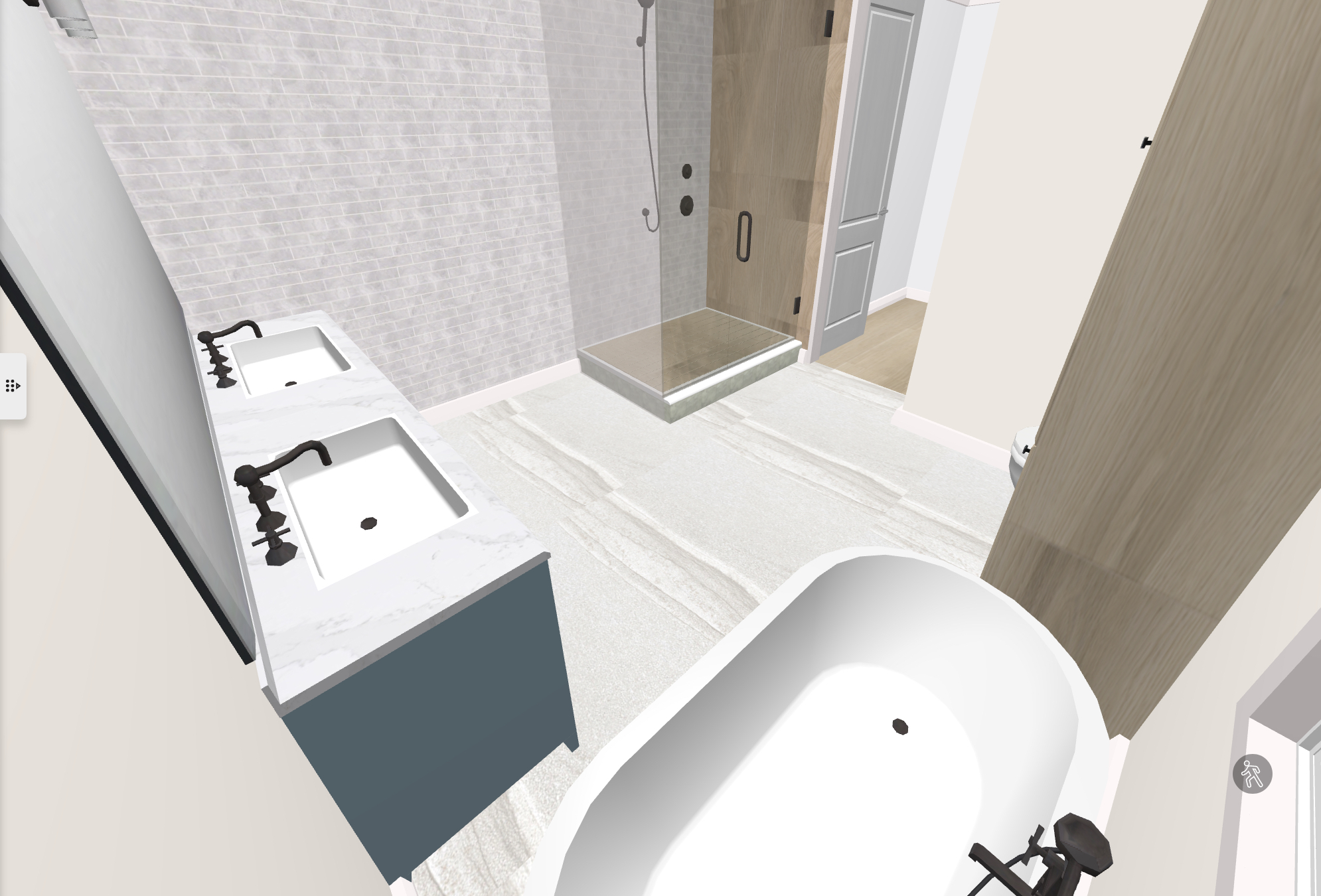this luxurious spa inspired bathroom boasts natural sunlight throughout the freestanding bathtub is highlighted by a chandelier from the ceiling above the double vanity is painted in a beautiful blue the tall linen cabinet done in light oak connects to the wood look tile on the shower floor and one wall in the shower the bathroom floor is clad with natural warm marble tile