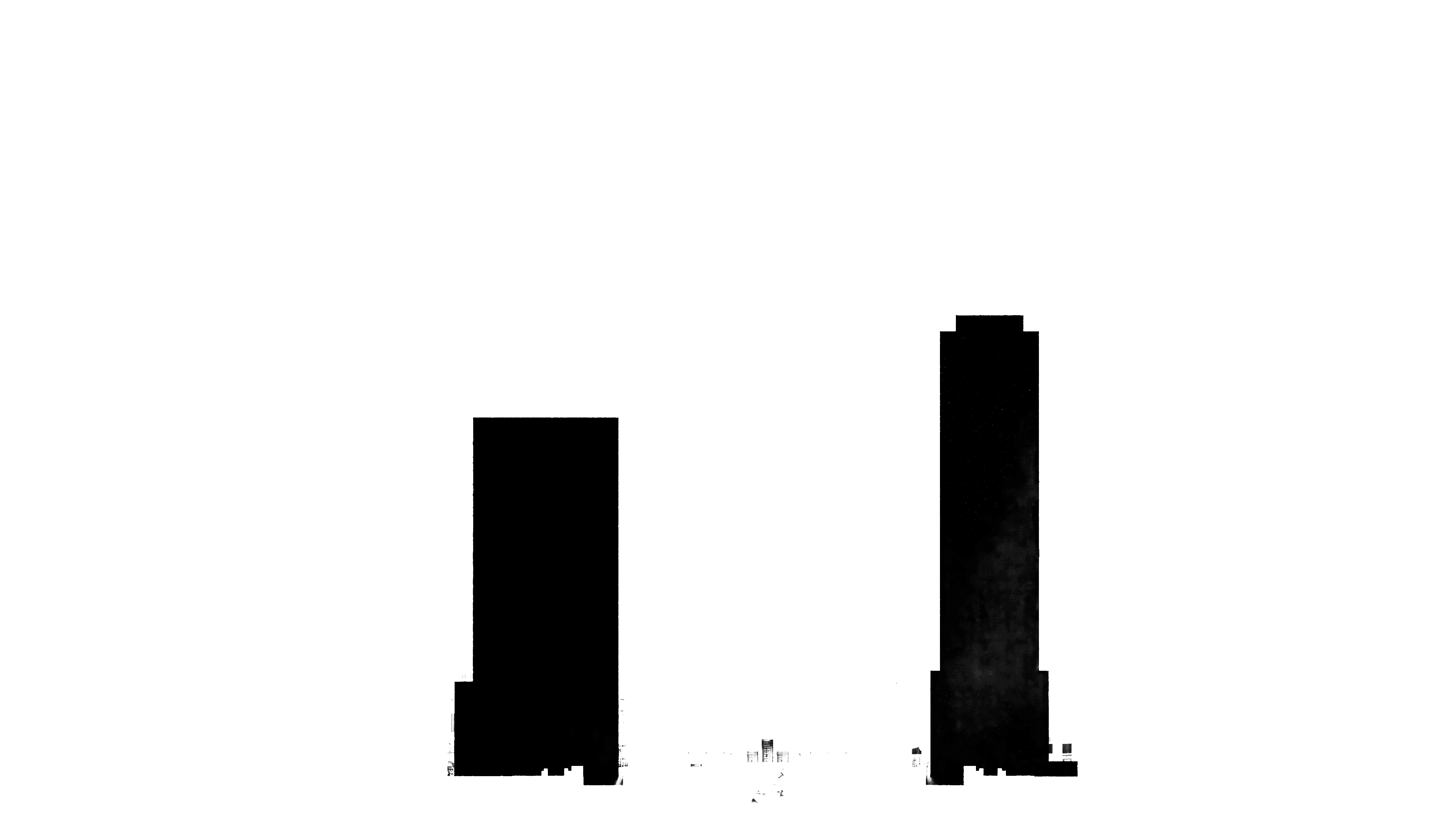 these black building silhouettes are architectural section cuts fill the interior of each black shape with stacked office floor plates showing the inside of a tall commercial office building in section maintain the exact outline proportions and edges of each black silhouette precisely do not alter the building shape in any way interiors should show horizontal floor slabs dividing each level a central structural elevator core simple open plan office spaces with desks partitions and glazed meeting rooms rendering style is a flat muted architectural illustration cool grey and off white tones minimal color subtle linework no dramatic lighting no warm glows no photorealism the background remains white section cut hatch lines on the floor slabs and exterior walls clean technical understated