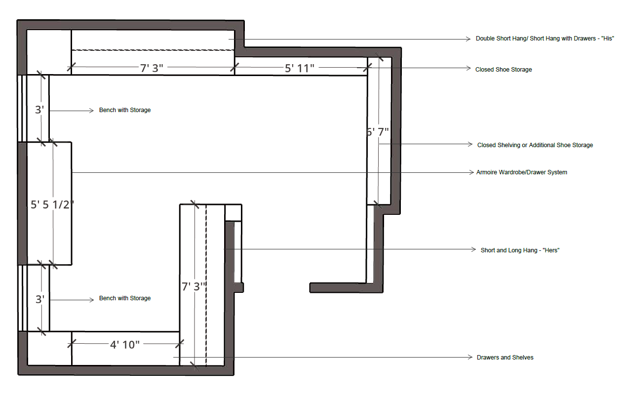 convert this floor plan into a realistic isometric 3d view of a full house show the space from an elevated angle with furniture walls and details visible this is a primary closet in yellowstone club montana so modern and ultra luxury closet with integrated led lighting floor to ceiling cabinets with neutral tones follow dimensions on plan along with the notes that follow the arrows to indicate the cabinet sections use the same furniture as shows on the plan do not change the orientation of the floorplan