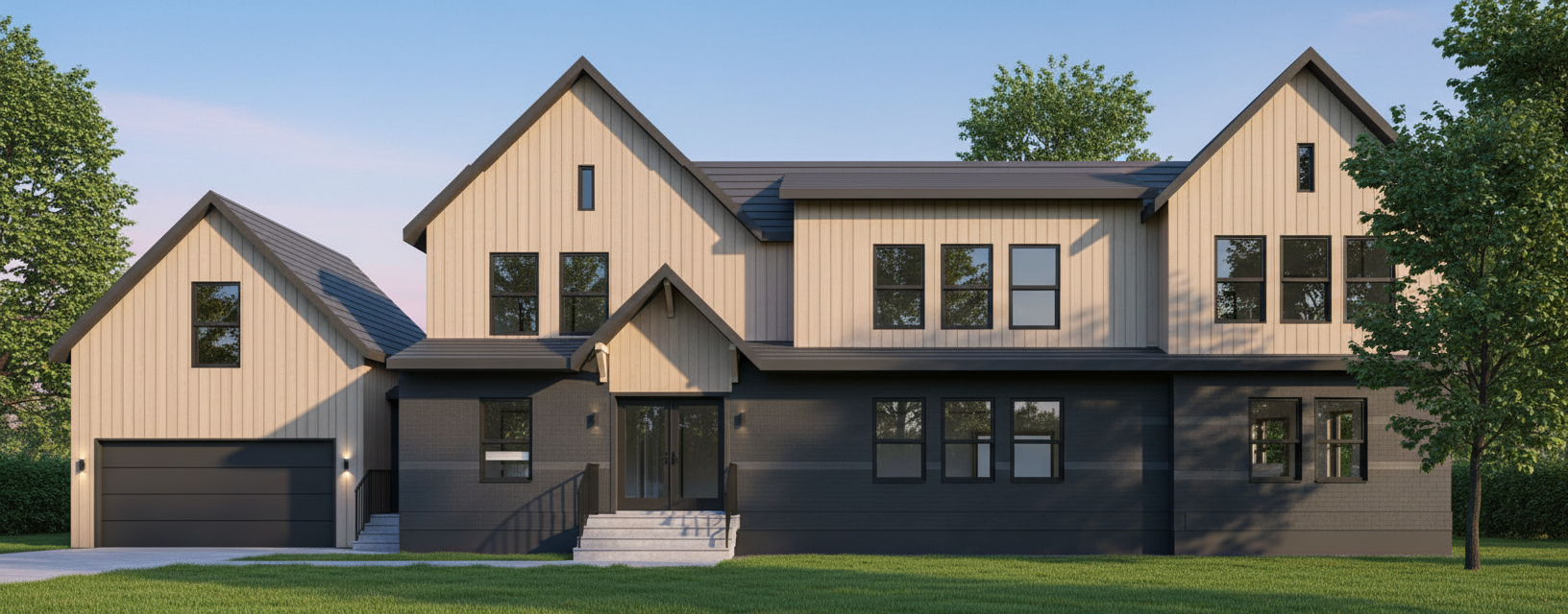 mediterranean revival exterior shot render a modern suburban house with a bright and inviting atmosphere the house has a classic design with three gables and a two car garage the exterior walls are color and material blocked soft wood paneling and deep dark gray the roof is a sleek dark charcoal gray black windows with grids the front steps and entryway are made of light gray stone surround the house with lush green grass and tall mature trees casting soft shadows the sky is clear with a gradient from azure to soft pink as if it s early evening architecture
