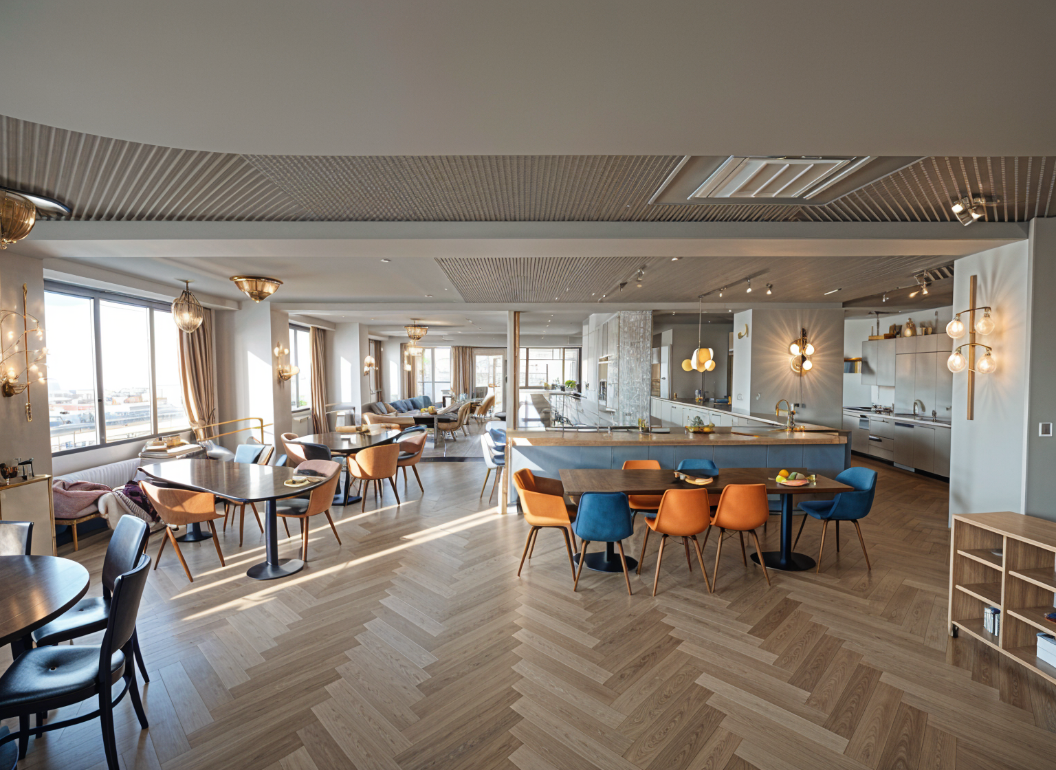 please create a soft light scandinavian atmosphere the kitchen is matte white the countertop and backsplash are natural oak the floor is also natural oak the wall is rosemary branch color the curtains are white the blackout is beige the sofa is beige the entire tv cabinet on the wall is uniformly medium oak with closed doors the cabinet reaches from the wall to the kitchen leave the carpet pattern as shown in the picture