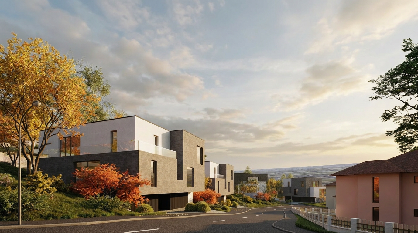 important preserve the existing geometry and the existing context exactly as provided do not modify alter reinterpret add remove scale or reshape any geometry do not change the site surroundings street layout neighboring buildings vegetation or context elements do not modify geometry scale proportions buildings road layout sidewalks or surrounding context in any way do not modify text do not add haze do not add lens flare remove the cars maintain background