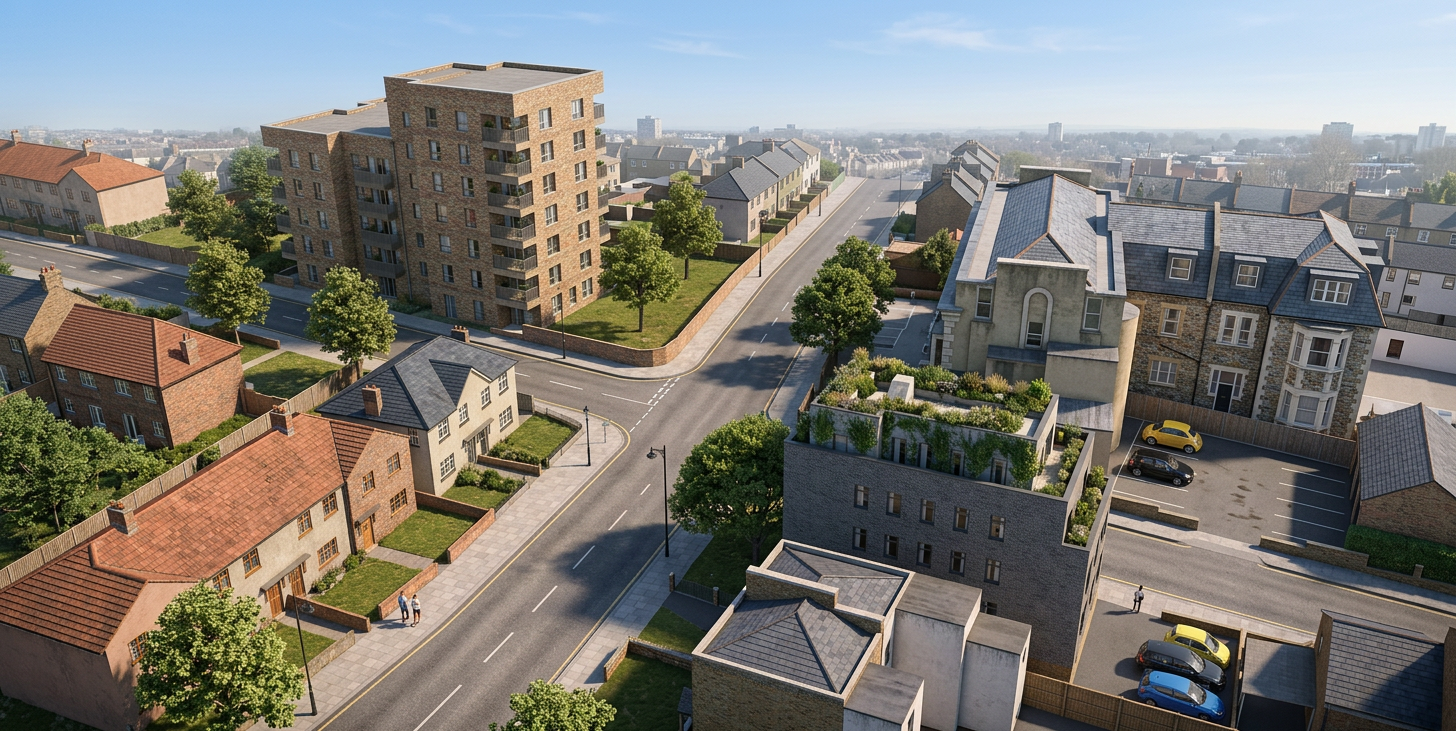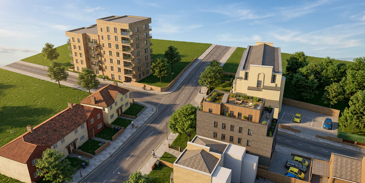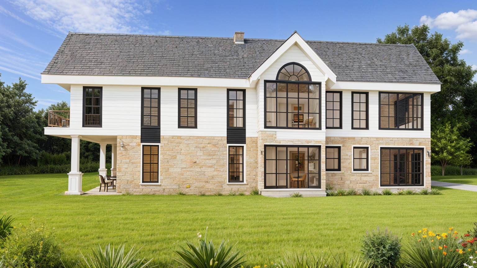 add trees in background for context add more vegetation and flowers on compound for context