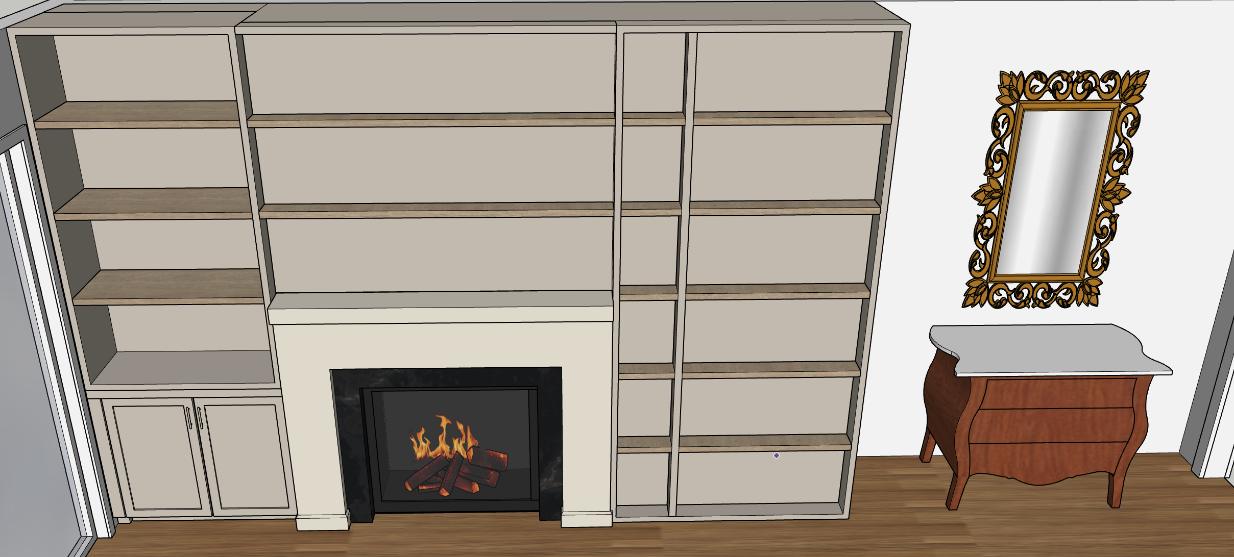 reate a realistic interior rendering of a custom built in wall in a bright bay area living room the wall features symmetrical built in bookcases on both sides of a central fireplace the built ins are painted a warm mushroom soft taupe color similar to benjamin moore pashmina the design is refined and architectural with flat inset panels minimal trim and clean vertical lines no ornate detailing the center fireplace has a smooth plaster surround in a warm bone tone with a simple modern profile and a black firebox insert the shelves are natural rift white oak with a matte finish the oak is light and neutral not orange or red the lower cabinets have simple inset doors with minimal hardware in aged brass on the right side of the wall a louis xv walnut cabinet with curved bomb drawers and bronze hardware remains in the room along with an ornate vintage gold mirror above it the antique cabinet should visually stand out as the darkest wood element fill the bookcases with a curated mix of neutral and warm toned books beige taupe muted blues soft greens stacked and vertical book arrangements ceramic vases in matte cream and clay tones small sculptural objects framed black and white art a few antique brass accents minimal greenery olive branch or soft trailing plant styling should feel european collected refined and quiet luxury not farmhouse not cabin not modern minimalist lighting soft natural daylight from the side warm 2700k integrated shelf lighting subtle shadows realistic materials keep the space warm elevated and cohesive with oak floors and light neutral walls