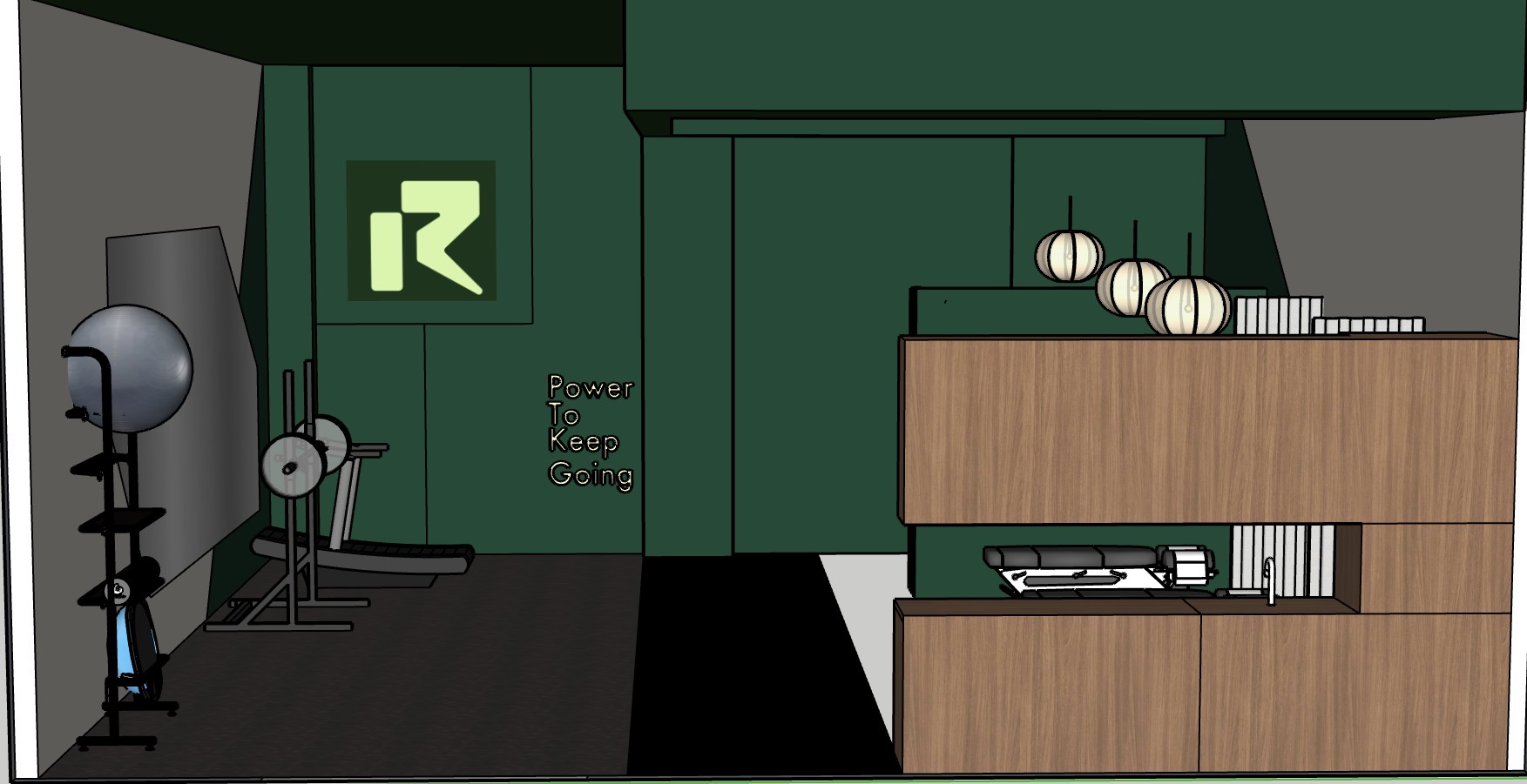 create a modern gym interior with a minimalist design the ceiling and back wall should be a deep forest green with a prominent logo in a matching gradient neon green the exercise equipment includes sleek black machines and a silver fitness ball feature a motivational sign saying power to keep going in gold lettering on the green wall the floor is black with subtle matte textures on the right a counter with warm wooden panels and softly glowing spherical pendant lights three down the right side of the gym casting a cozy ambiance the atmosphere is motivating and serene blending functionality with style