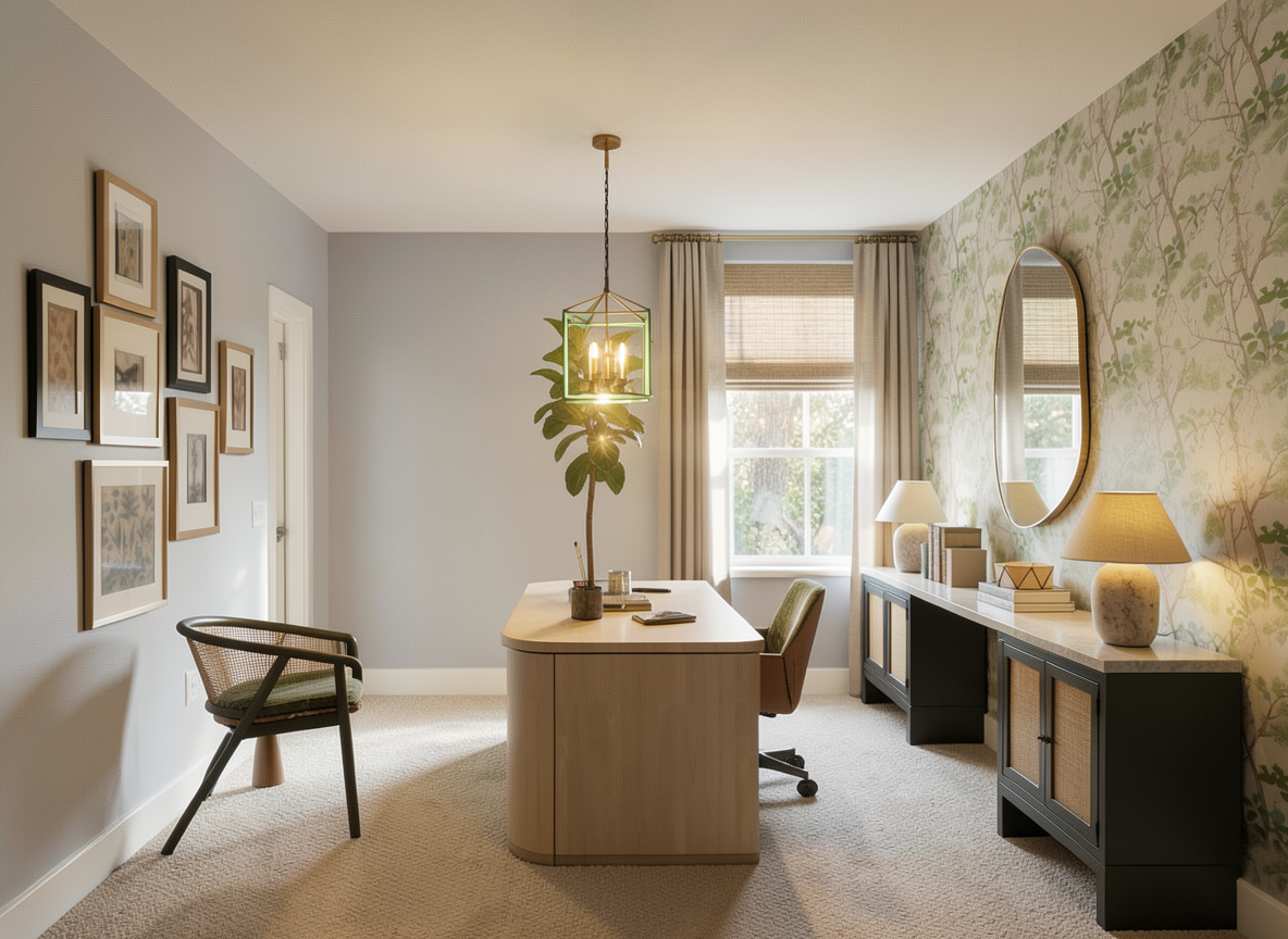 photorealistic interior rendering of a modern warm minimalist living room maintain the exact camera angle and full composition from the original view do not crop or cut off the l shaped gray sofa it must be fully visible within the frame including both sections of the l the space features a narrow layout with a wooden floor in warm tones beige and soft brown walls and a clean white ceiling with recessed spotlights on the left wall include floating wooden shelves with decorative objects such as books vases and plants add a continuous warm led strip light along the upper edge of the left wall at the back include a large window with sheer white curtains allowing soft natural daylight to enter place indoor plants near the window in front of the sofa include a light colored textured rug a round coffee table and a small ottoman add a modern floor lamp with warm light on the right side next to the sofa lighting should feel like daytime with warm artificial lights turned on creating a cozy and balanced atmosphere preserve all materials textures colors and proportions exactly as in the reference image avoid distortions avoid changing furniture layout and ensure the sofa remains fully framed and not clipped by the image boundaries si quieres puedo hacerte una versi n a n m s estricta tipo negative prompt para evitar que archsynth lo recorte eso ayuda mucho en estos casos