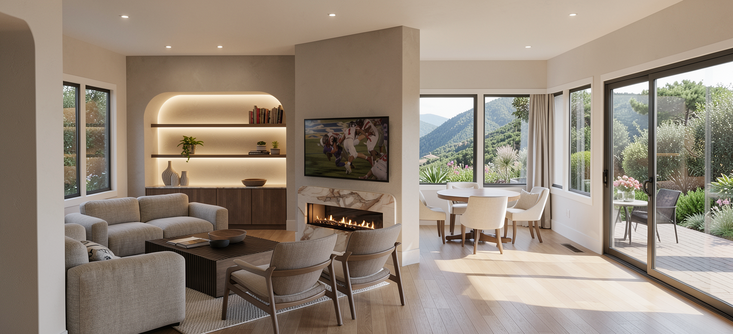 living room looking out over hillside back yard 5 wide outdoor patio with no furniture outside of patio door to the right that ends 12 past the end of the door recessed lighting soft indirect lighting at built in arched feature