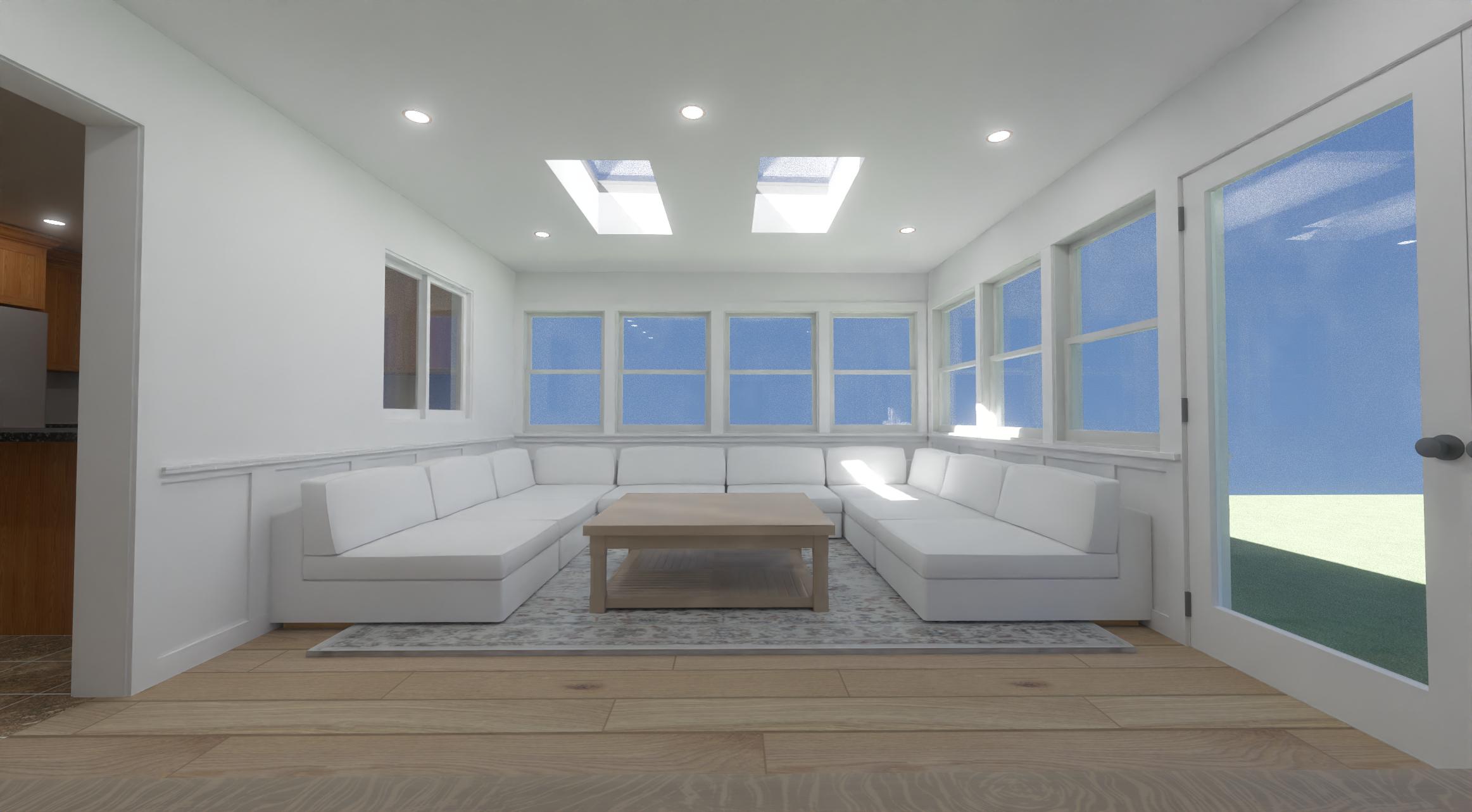 create a photirealist image for this room include some staging with vase on the coffee table background is a backyard with greenery