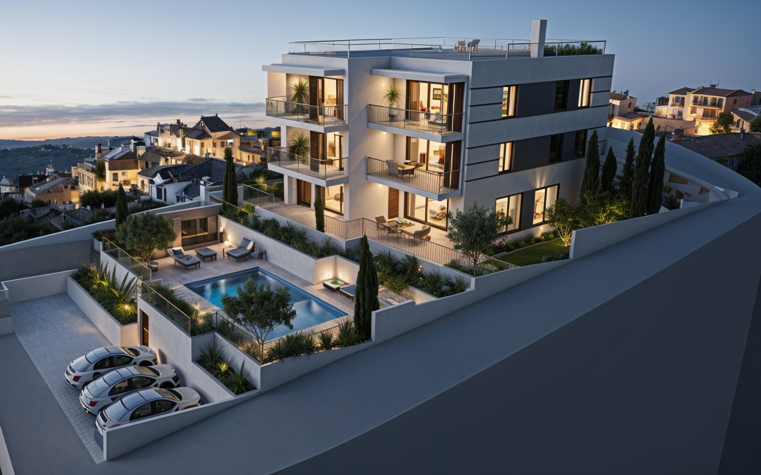 exterior shot a modern minimalist building simple rectangular shape with evenly spaced windows exterior walls in sleek white windows with clear glass reflecting the sky framing the windows light gray metal to add contrast surrounding the building small green trees with vibrant foliage the atmosphere is peaceful and serene under a clear blue sky with soft white clouds the setting is tranquil evoking a calm harmonious environment