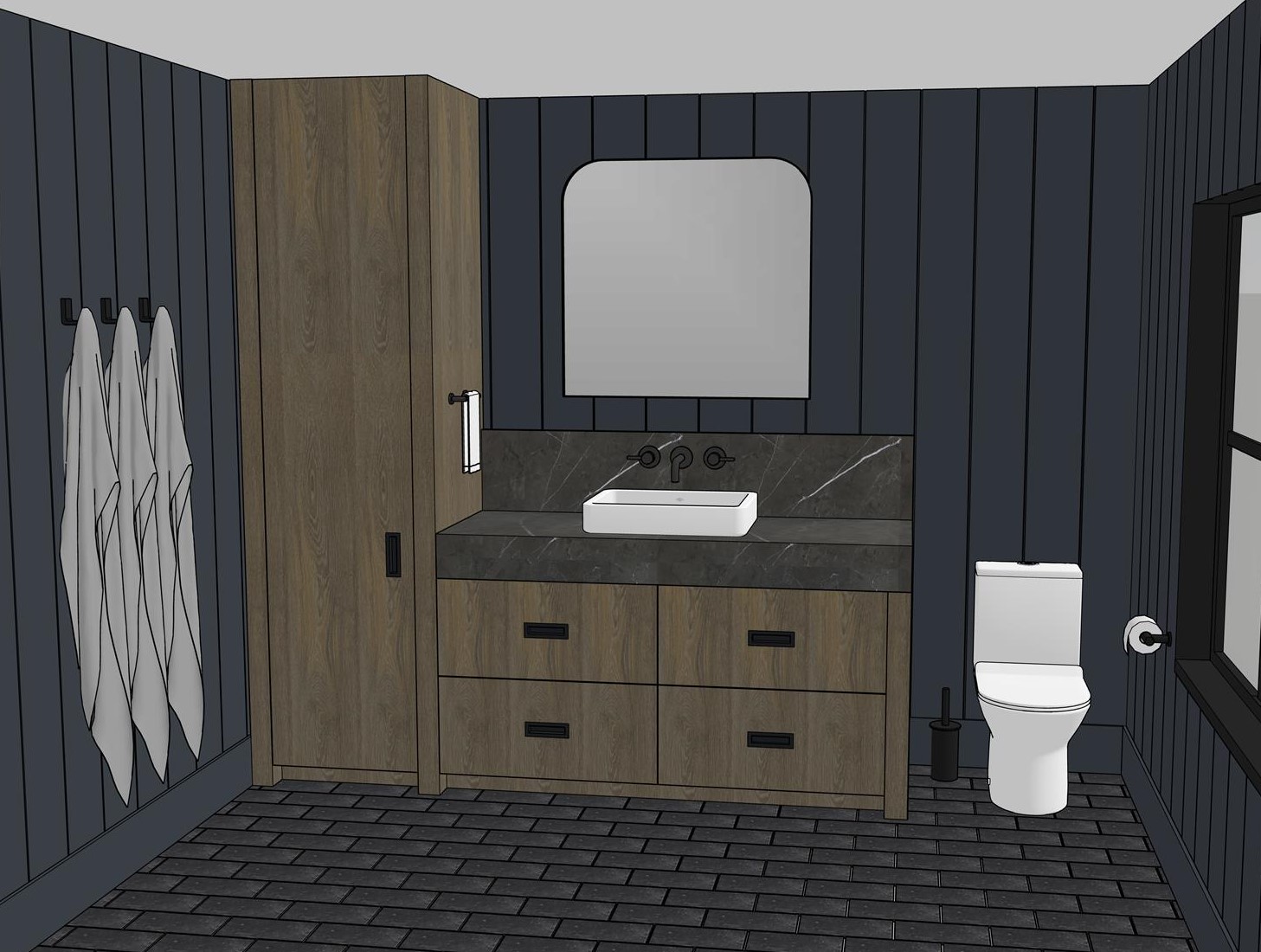 add overhead bright lighting add daytime light add charcoal stone floor tile keep baseboards blue