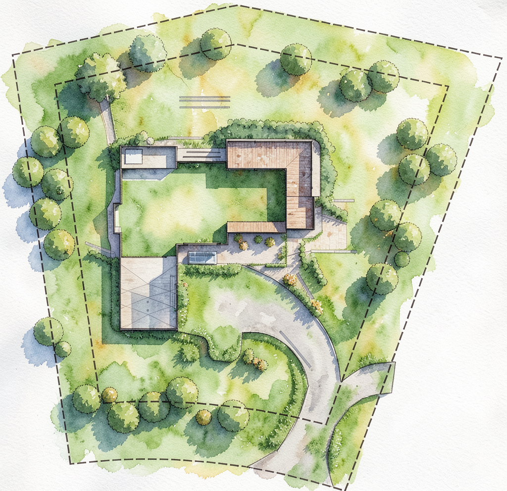 watercolor landscape plan cars in garage pine trees
