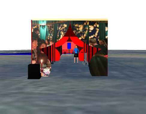 op de vloer hangt rook achter in de gang staat er een tv en er schijnt een fel licht naar je toe op de tafels rechts in de tekening staan allemaal amuses en er staat een hostess naast buiten de gang is een park met veel groen en zonnig weer