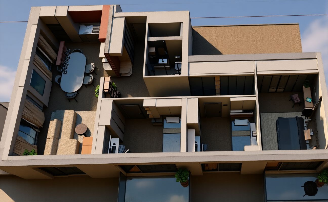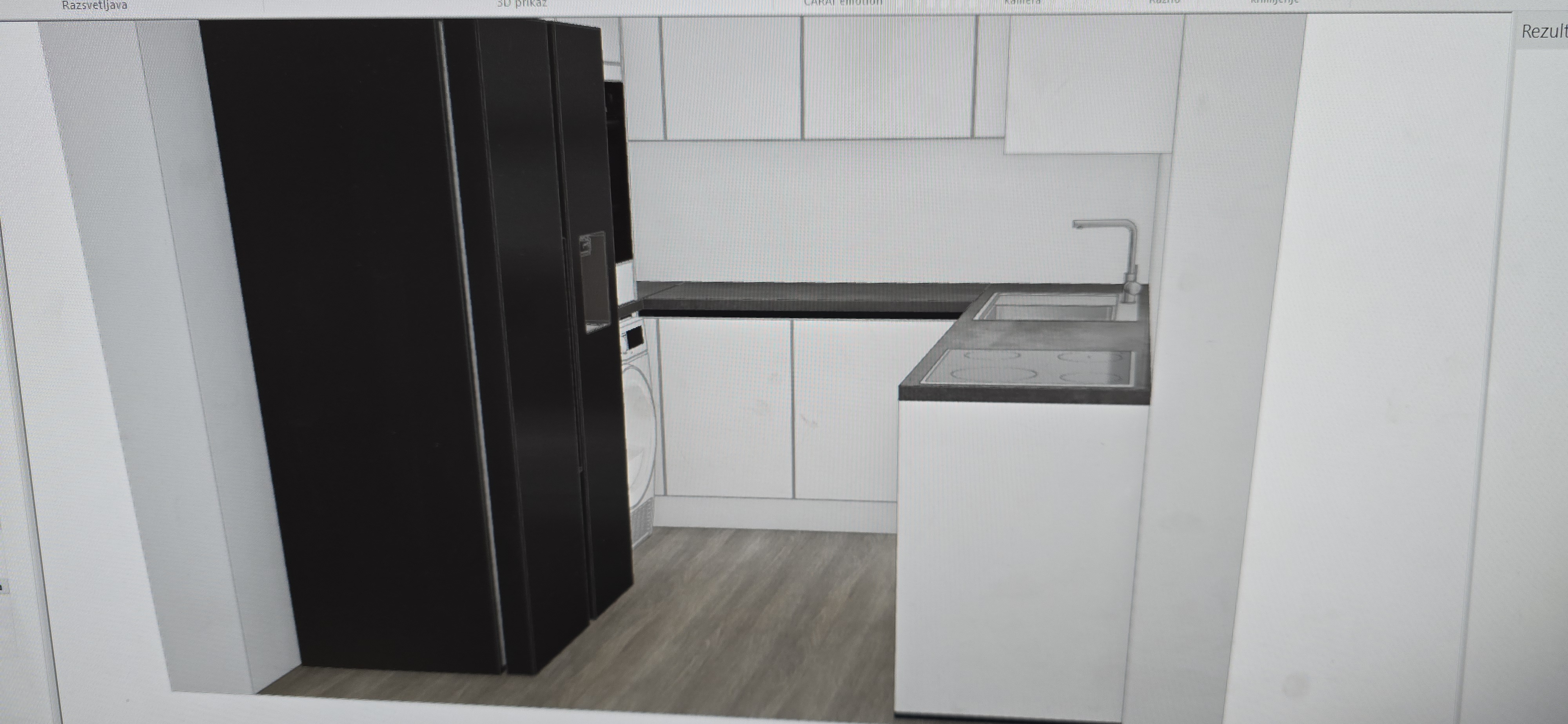 create a modern minimalist kitchen in an l shape layout emphasize sleek white mat cabinets with dark grey antrazite countertops the fridge should be a matte black with stainless steel accents include a built in washing machine and oven in neutral tones design the flooring with a light natural wood texture use soft ambient lighting to create a cozy inviting atmosphere the walls should be a subtle off white to enhance the clean modern look be precize and do not change the position of the cabinets