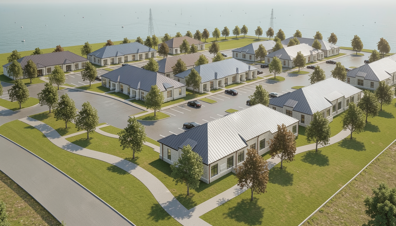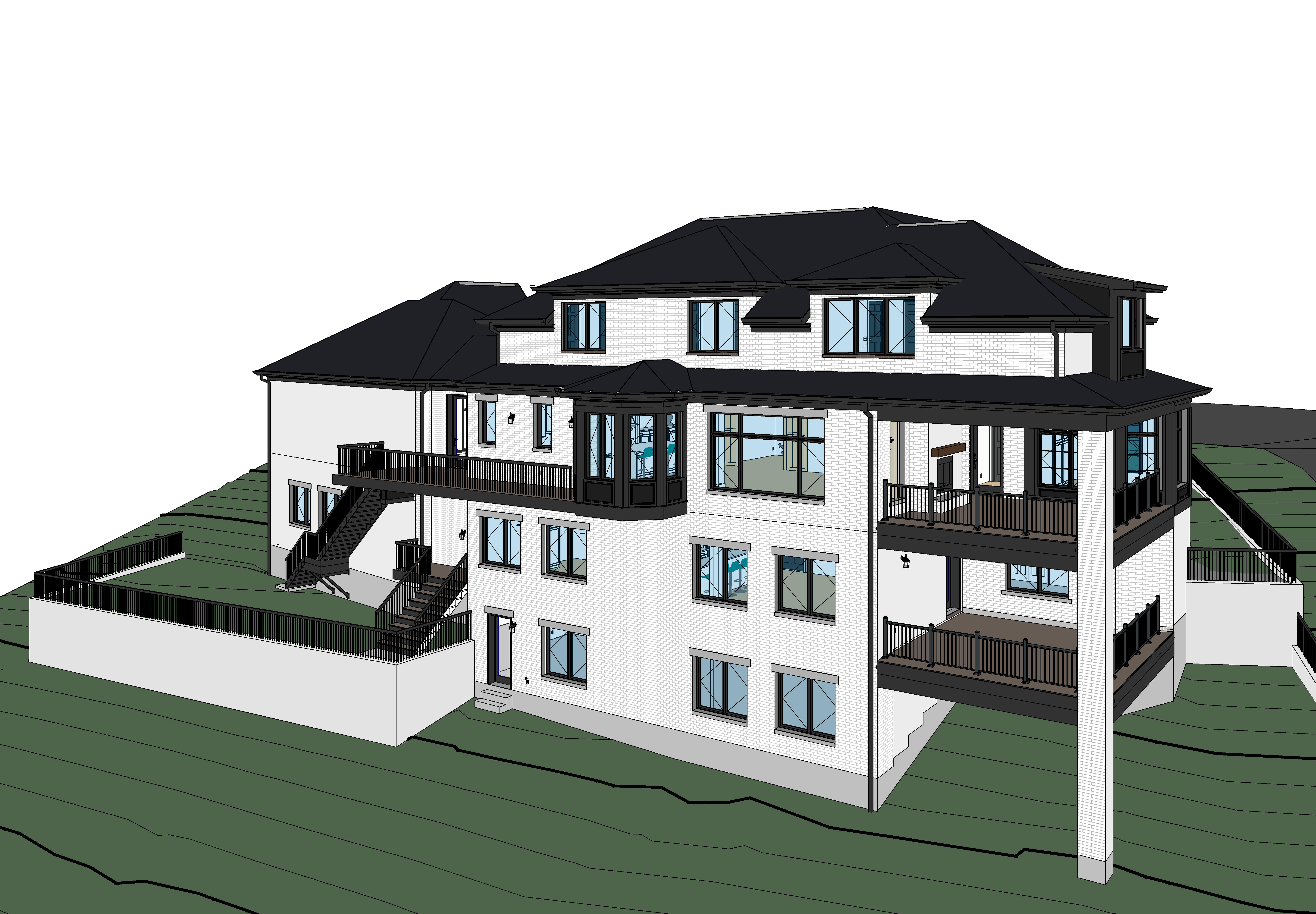 strict maintain exact building geometry massing proportions rooflines window door locations trim profiles and camera perspective from the input revit model do not modify architecture layout or add remove elements project high end custom residential home in cincinnati ohio set on a sloped suburban lot architectural style materials primary exterior painted white brick with subtle natural variation and realistic mortar joints accents stone headers and stone sills at all openings light gray limestone appearance trim black painted trim at windows fascia soffits and architectural accents matte finish windows dark framed black aluminum clad crisp reflections no grid distortion roofing main roof black asphalt shingles dimensional texture realistic shadowing dormers accents black standing seam metal roof subtle sheen clean seams garage doors wood tone garage doors with glass lites warm natural wood natural grain not orange rear deck railings black metal railing system clean modern lines maintain all deck levels and stair configurations exactly as modeled lighting updated fix scale quality replace all exterior light fixtures with properly scaled high end residential fixtures fixtures must be proportionate to doors windows and wall height no undersized or oversized fixtures style modern transitional matte black or dark bronze finish entry larger statement sconces flanking door appropriately scaled to door height garage evenly spaced sconces centered on each bay correctly sized rear patio minimal clean wall mounted fixtures not decorative clutter lighting effect soft warm glow 2700k 3000k subtle and realistic no overexposure lighting environment time of day soft golden hour early evening for warm highlights and long shadows sky lightly overcast with warm sun break for balanced contrast interior lights subtle warm glow visible through windows site landscaping keep subtle clean high end residential landscaping low ornamental grasses small shrubs minimal planting beds near foundation do not overpopulate with plants or obscure architecture maintain slope of site exactly as modeled rendering style photorealistic architectural magazine quality luxury residential publication balanced exposure slightly warm tones high dynamic range crisp edges realistic materials no stylization or painterly effects camera composition eye level perspective slightly wide lens not distorted strong focus on entry and massing hierarchy clean foreground no clutter