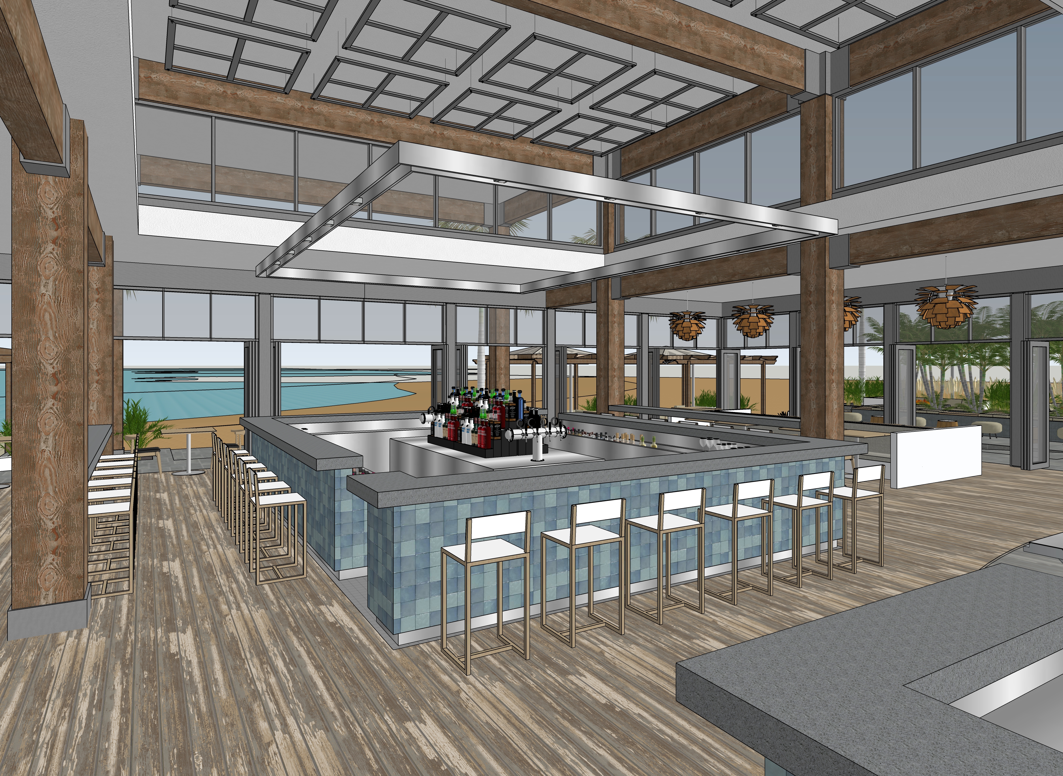 evening view location is a beach resort on the red sea egypt the views beyond the building are of the horizon over the water add low level lighting effects to the inside of the restaurant add people sitting the restaurant at the tables and stools add drinks and food to the tables and bars the columns and beams are made of heavy wood timber add up lighting to the the ceiling add people sitting at the bar on the stools keep the perspective view in the source image add three sailboats on the sea near the horizon add a waiter walking at the right side of the view make the square suspended lighting over the bars stainless steel material add people sitting at the stools on the left side of the view add detail to the bar service area and a bar tender working add palm trees and some people on the beach outside on the right side of the view add people sitting outside on the right side of the view add more people sitting at the bar with drinks add wine glasses and three wine bottles sitting on the counter in the right side foreground of the view add a woman walking on the left side of the view add people sitting in the stools on the left side of the view make the bar countertops black granite with a semi rough finish