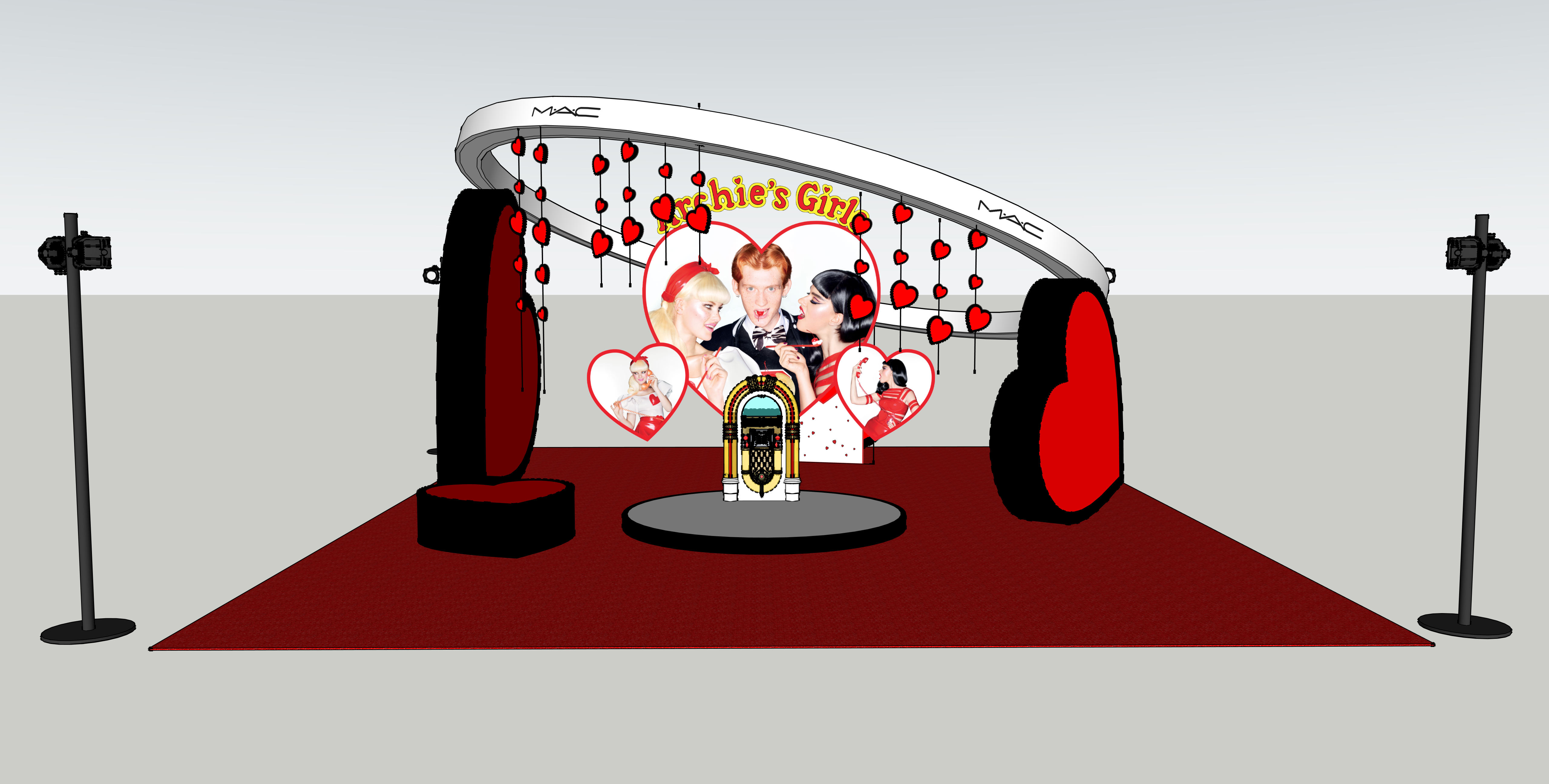 place this in a hotel meeting room make the heart outlines black and make them high gloss make the white halo in white spandex put lighting from the spot lights on the setup