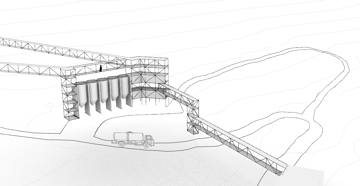 exterior shot un centro de recciclaje de productos industriales se encuentra en un bosque con muchos arboles y mucha naturaleza salvaje el edificio es de estructura metalica sin paredes sin ventanas sin vidrios solo se ve la estructura tambien contiene un parte de chapa esta al aire libre que contiene unos silos para cargar el material a camiones se ven unas carreteras que solo tiene acceso de camiones y desde el edificio salen unas pasarelas metalicas sin vidrios al aire libre que la gente puede andar por ellas architecture