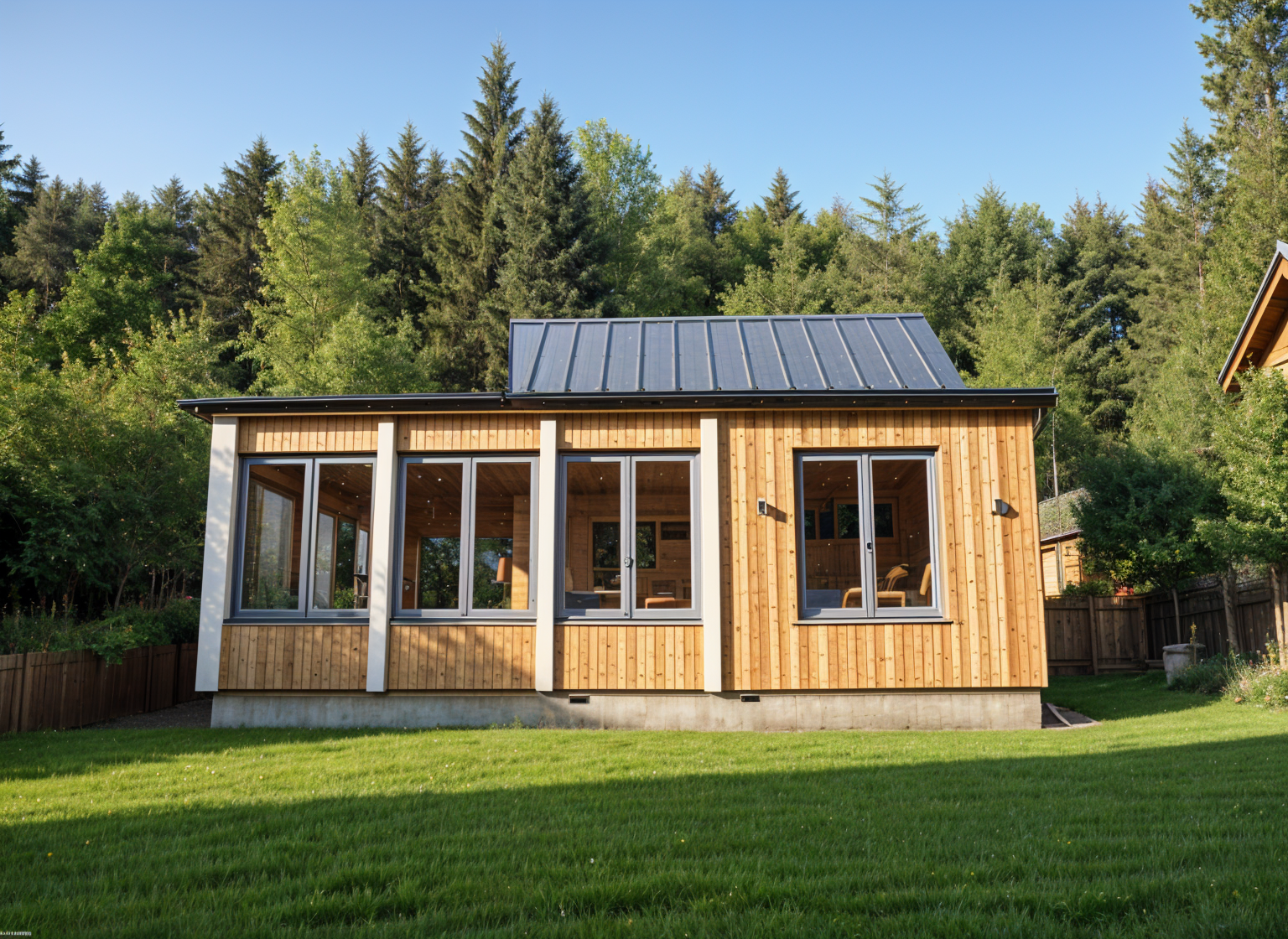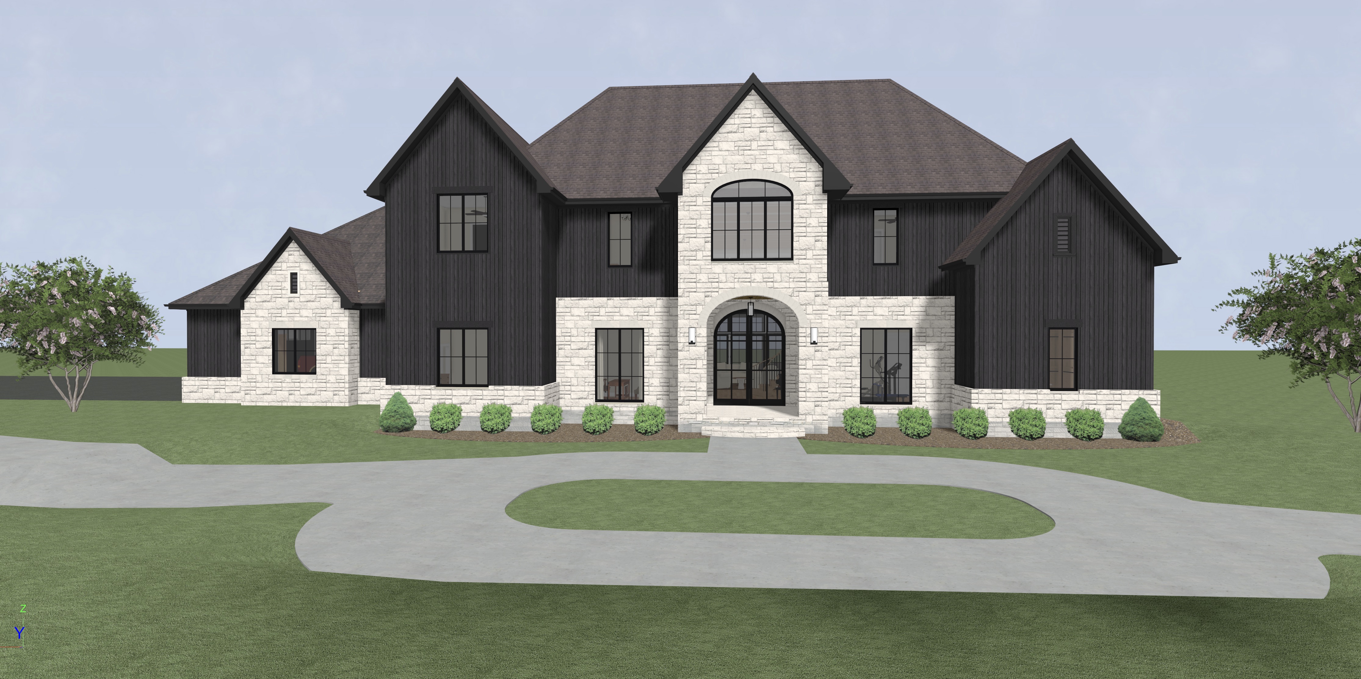 house with full height arched glass doors and a circular driveway with elegant landscaping architecture